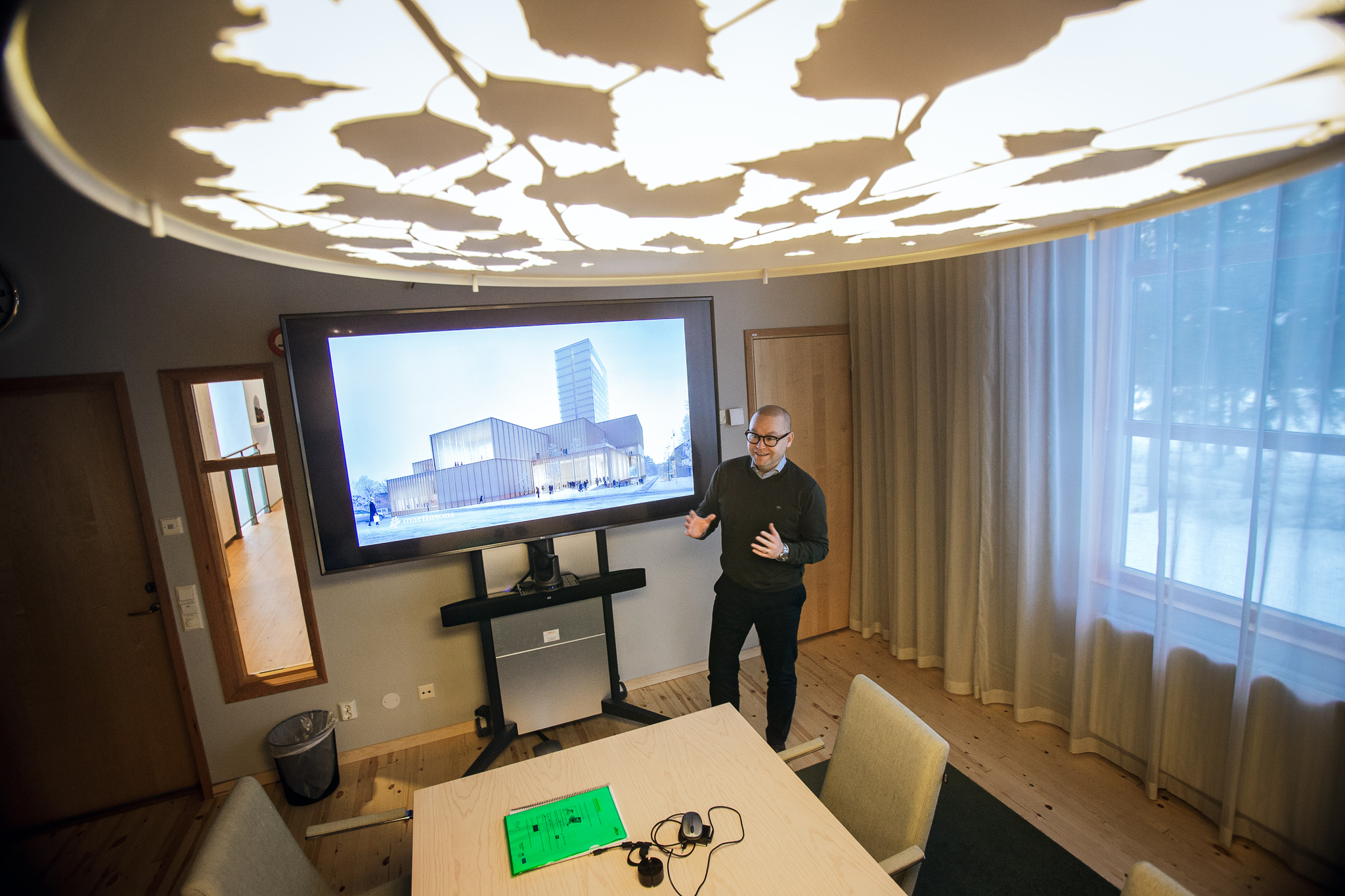 - Beskrivning: Jesper Åkerlund VD Martinsons Byggsystem AB pratar visar vad han kallar ”monsterprojektet” i limträ och KL-trä, Sara Kulturhus i Skellefteå.