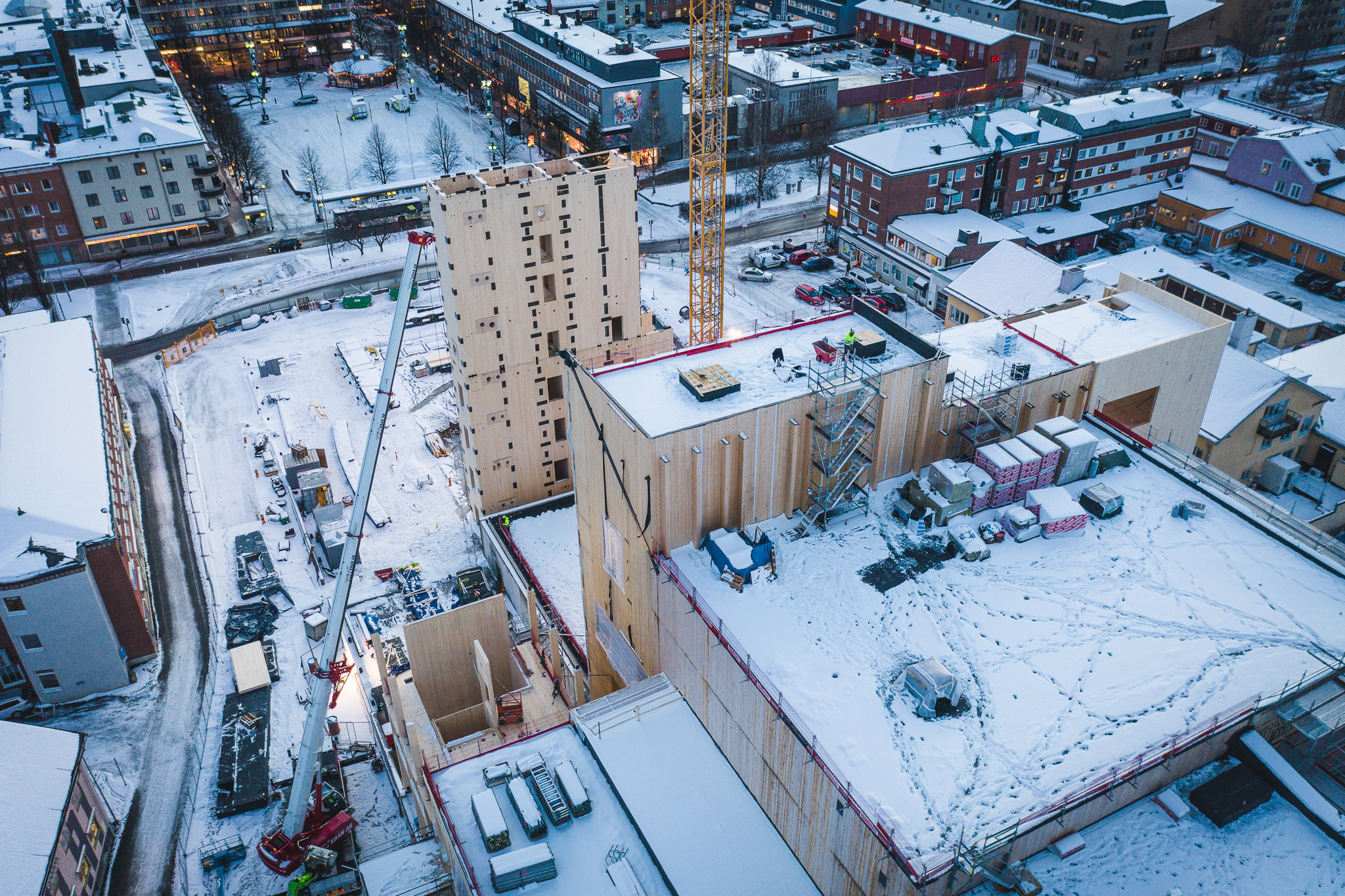 - Beskrivning: Sara Kulturhus heter den omtalade kolossen av framför allt limträ och KL-trä. Den färdiga byggnaden ska inrymma ett hotell med över 200 gästrum samt en kulturdel med bland annat stadsbibliotek och sex scener vars totala yta uppgår till 12 000 kvadratmeter. Sara kommer att ha hela 20 våningsplan och den högsta punkten landar på över 70 meter, vilket ligger bra nära det stående världsrekordet på 80 meter. Bygge, slutanvändning av råvara, träråvara, skogsråvara, virke, hus, trä