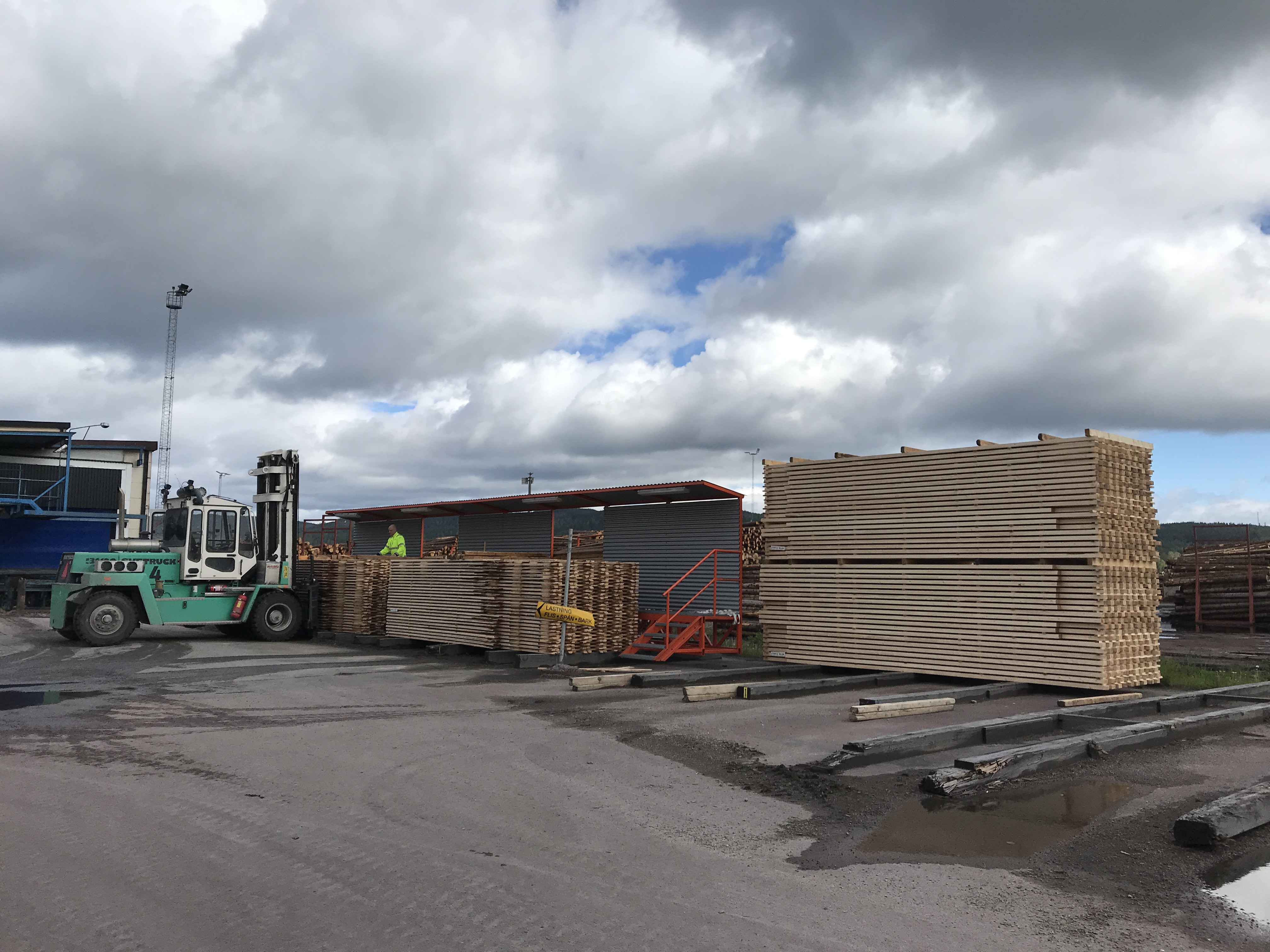 - Beskrivning: Besök hos Bergkvist Insjön 2019-05, produktion, trä, plankor, virke, staplade, produkt, sågverk