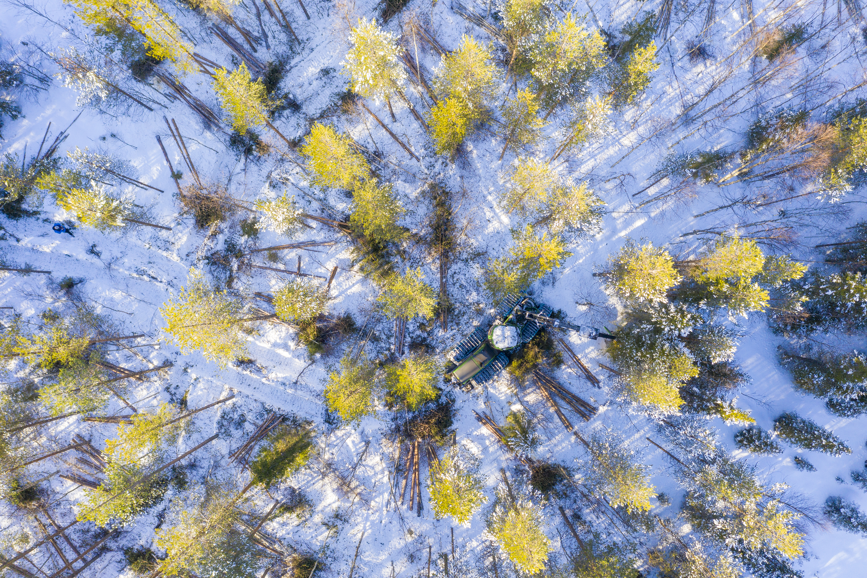 • Beskrivning: Avverkning, skördare, vinter, John Deere, drönarbild, flygfoto, ovanifrån