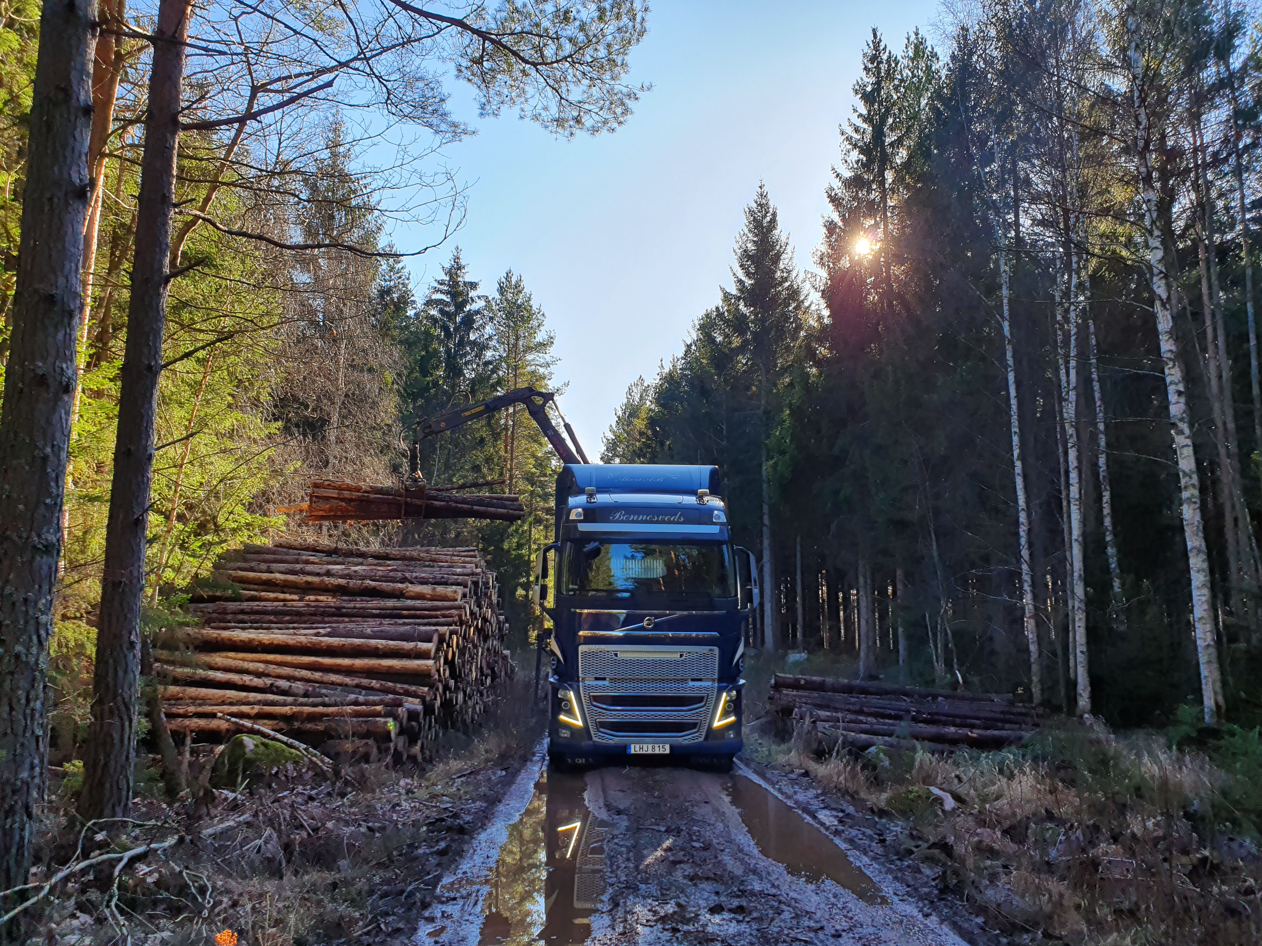 - Beskrivning: Timmerbil, lastning, skogsväg, timmervälta, avlägg, lastbil, logistik. Bennesveds.