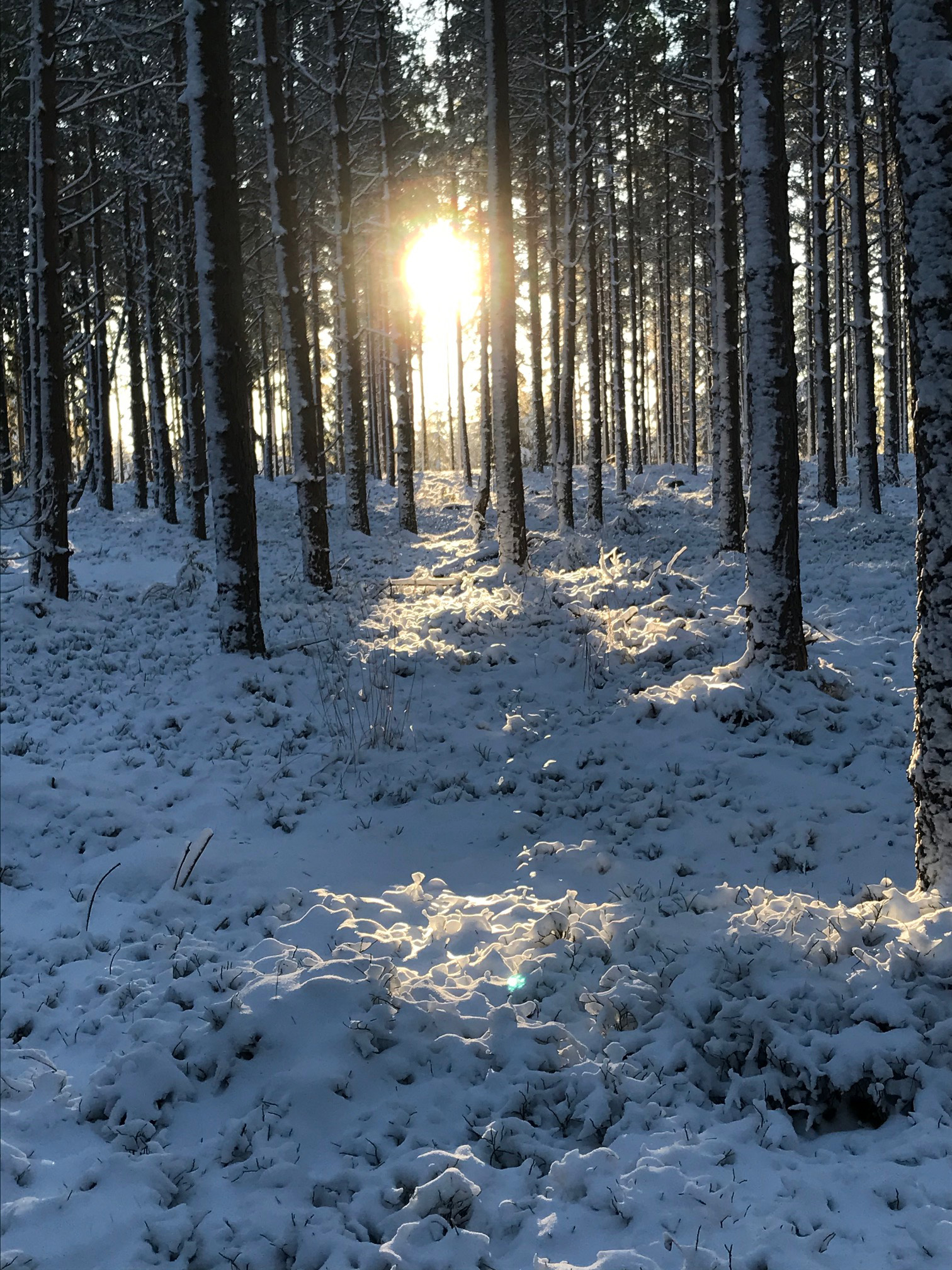 - Beskrivning: Vinter, snö, skog, sol genom trädstammar