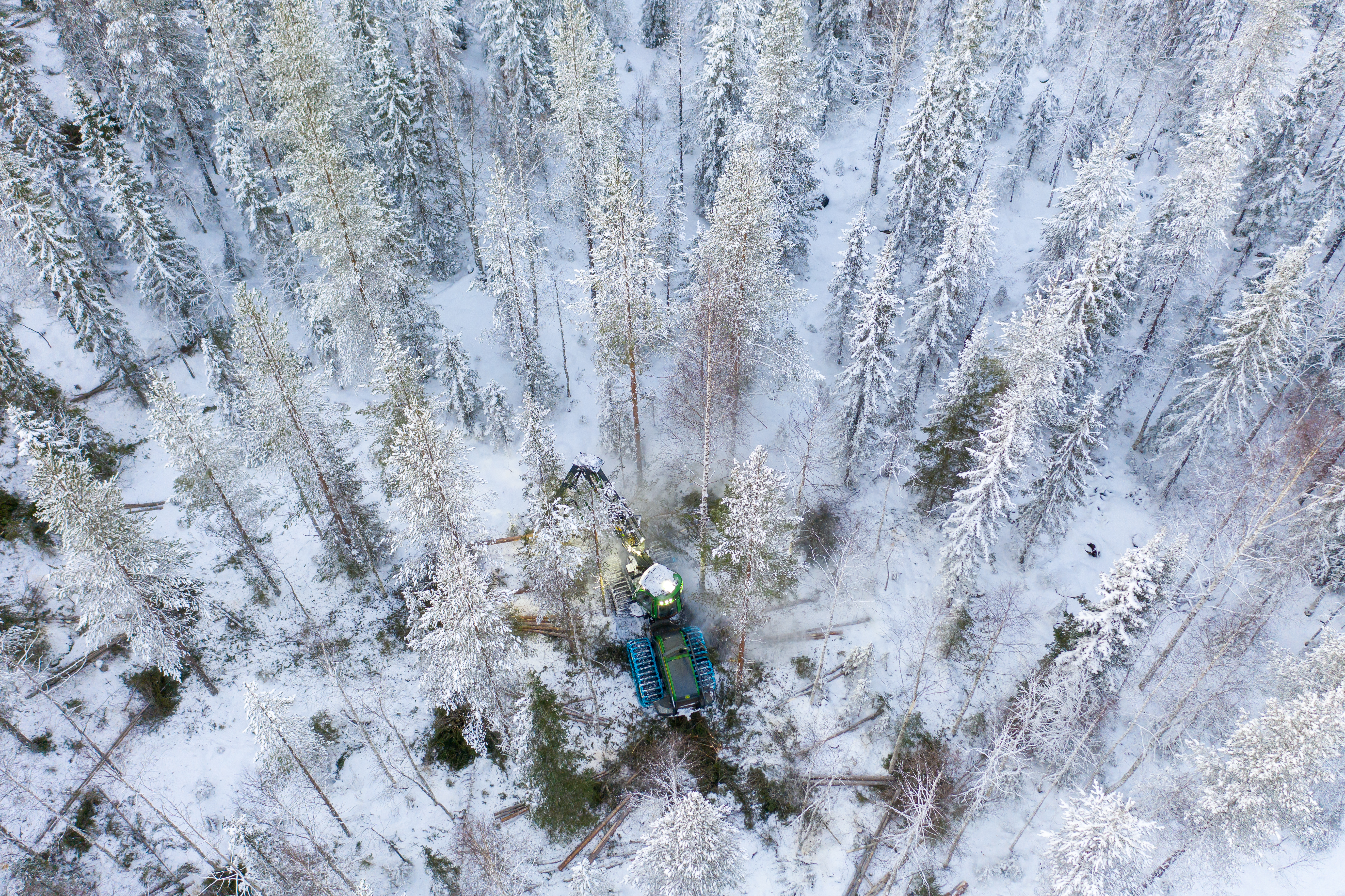 - Beskrivning: Maskinlag i MO Nord, Norrbotten, avverkningslag, avverkning, timmer, virke, skogsbilväg, skogsmaskin, skördare, snö, vinter, avlägg, välta, drönarbild, flygbild, från ovan