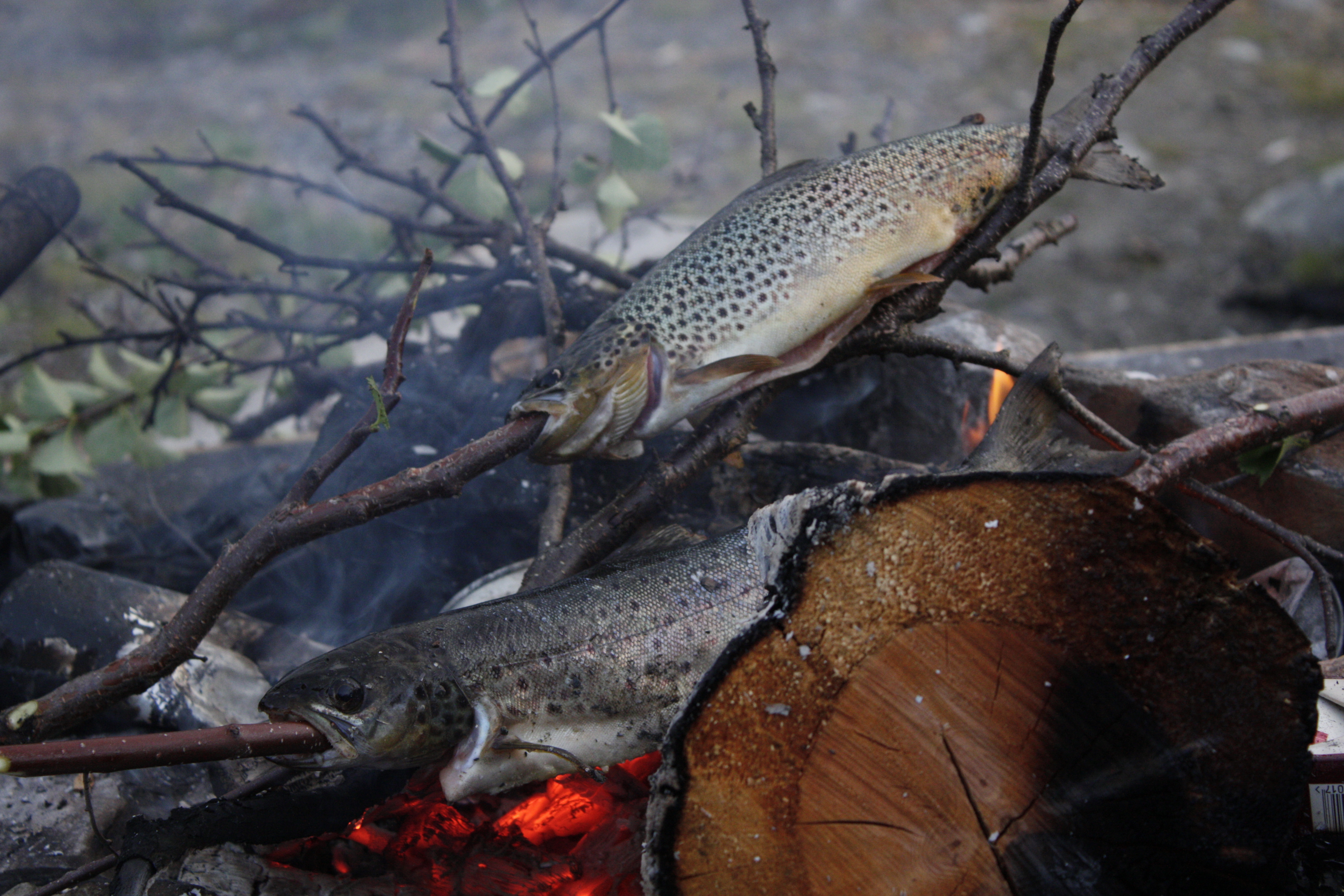 - Beskrivning: Halstrad öring, öringsfångst, matfisk, glöd, brasa