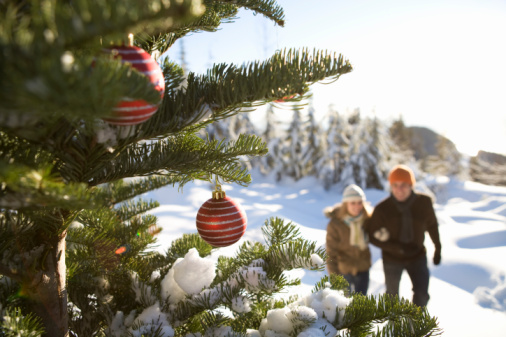 - Beskrivning: Julgran, par på promenad, vinter.