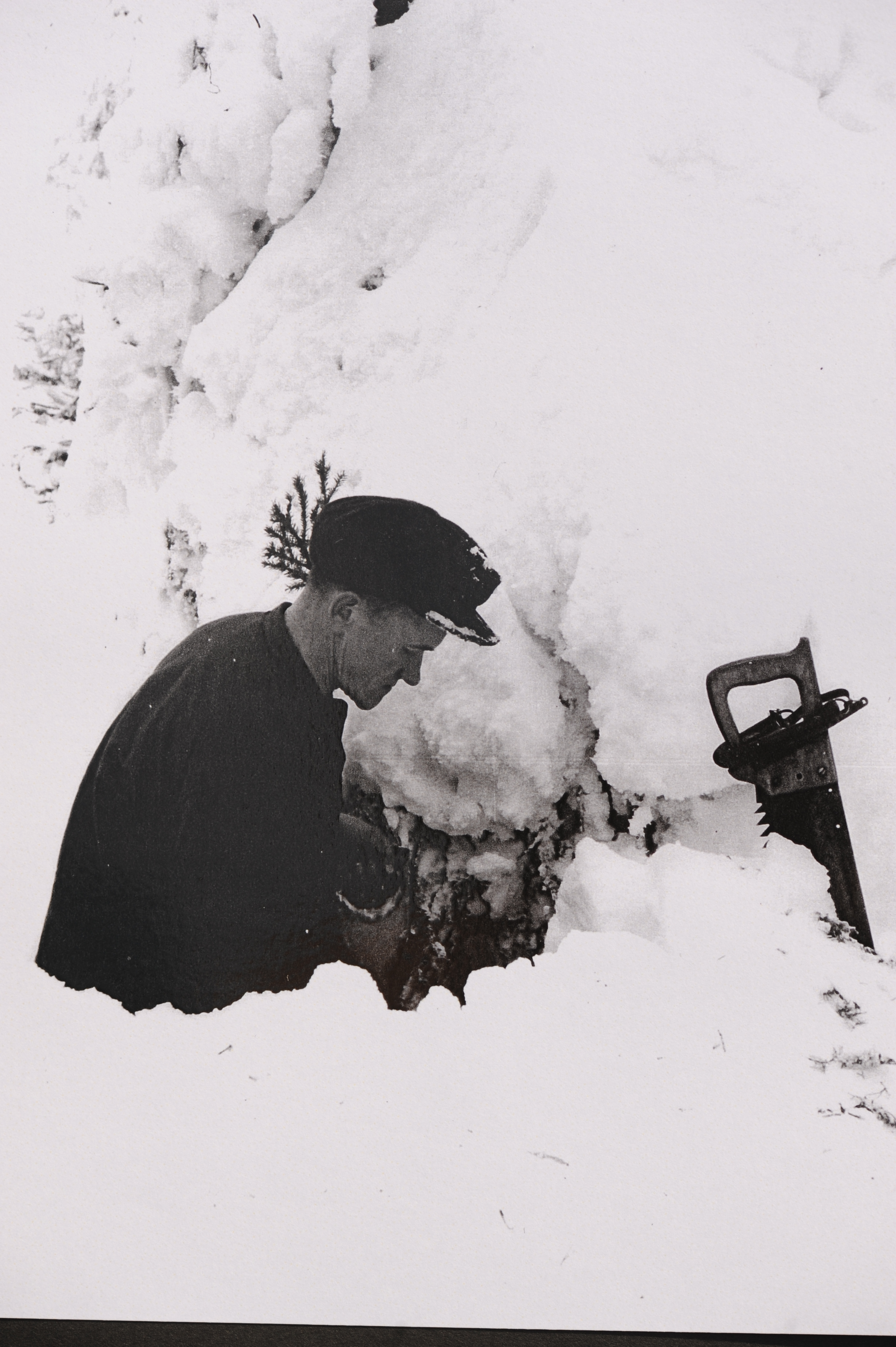 • Beskrivning: Upplegan i träden gjorde arbetet farofyllt. När man gjorde inhugget för fällsköran rasande en massa snö ner på ryggen. Vid stor snötyngd kunde trädet spjälkas och falla åt vilket håll som helst. Att hinna undan i dem djupa snön krävde en hel del akrobatik.
