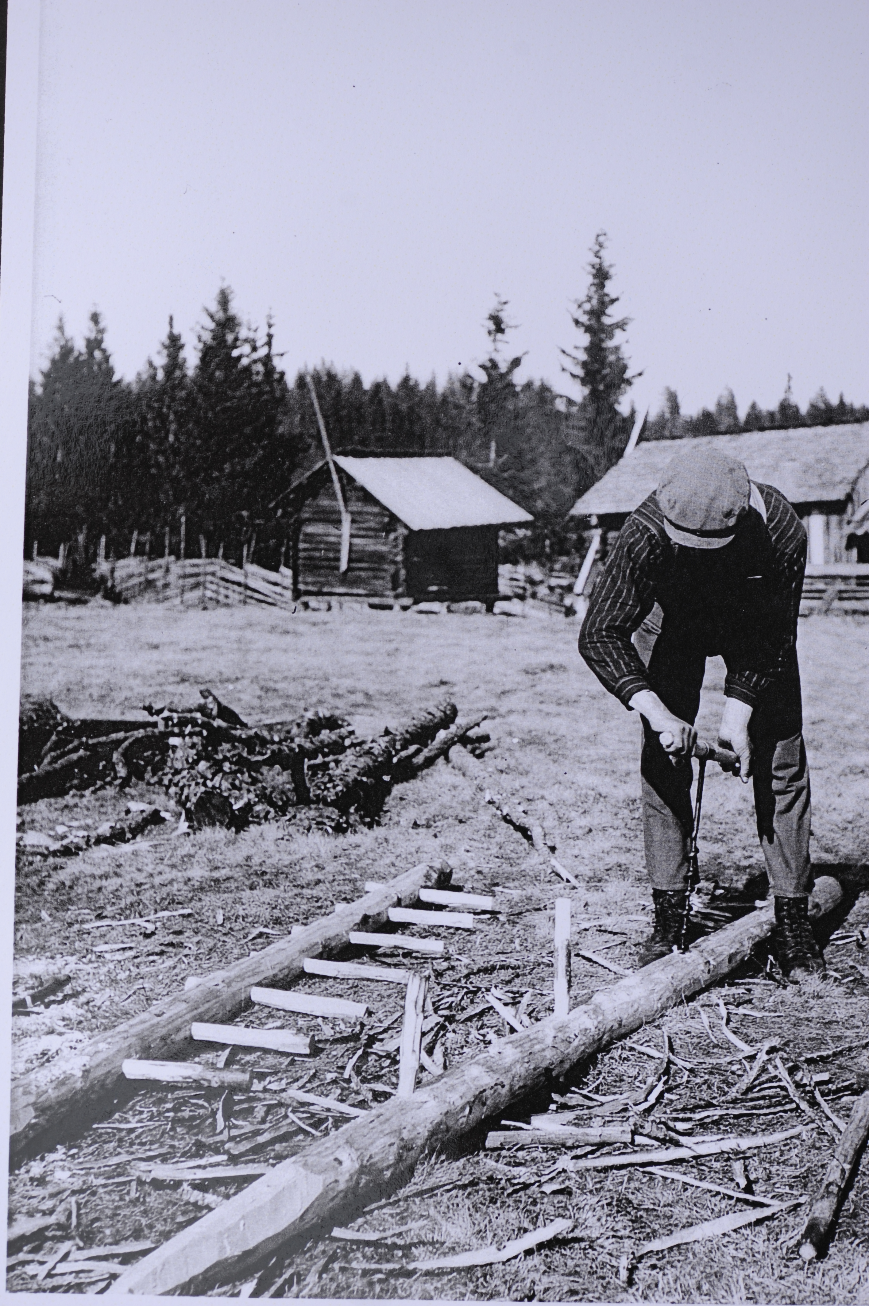 - Beskrivning: Dom flesta skogshuggare i glesbygden hade på sin "lediga" tid under sommarhalvåret fullt upp att göra med alla sysslor som hörde till ett jordbruk med djurhållning. Med hjälp av släkt, vänner och vädrets makter på sin sida hann man oftats med alla göromål som måste utföras. Kvinnornas strämvsamma arbetsinsats hemma på gården under det mörka vinterhalvåret när männen arbetade i skogen glöms ofta bort i sammanhanget. Dom var en viktig kugge i hjulet för att hålla igång den svenska skogsnäringen.