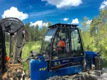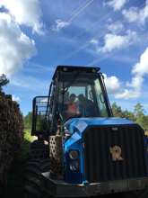 Beskrivning: Skördare i Godegårdsskogarna, drönare, flygbild, från ovan. Avverkning, skogslandskap