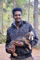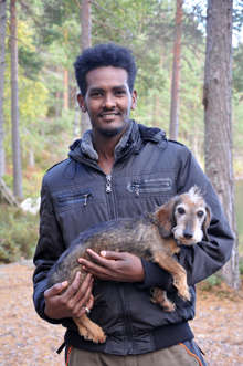 Beskrivning: Dawit Kesete med hund i famnen. Sveaskogs integrationsprojekt Växtkraft, integration, nysvenskar
