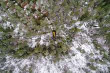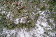 Beskrivning: Vinterskog, flygbild, drönare, skog ovanifrån