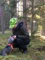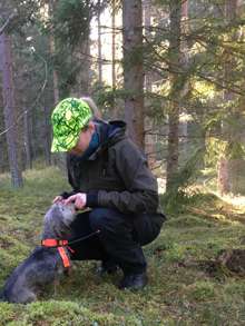 Beskrivning: Ägare och hund, hunden har på sig en hundpejl, GPS, spårning, pejl