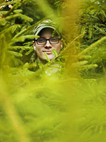 Beskrivning: David Ventorp, Forum Sveaskog nr 2 2014, Bråda tider för David, skogsskötselledare, träd, grenar, gran, granris, grönt, barr