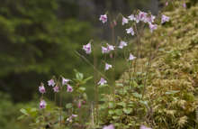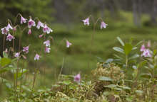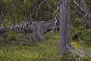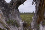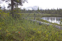 Beskrivning: Hjortron i förgrunden. Död ved. Ekopark Tjadnes-nimtek