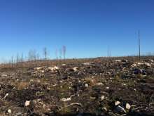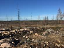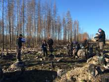 Beskrivning: Efter skogsbrand, pånyttfödelse, Kundbesök i brandområdet utanför Sala, jord, plantor, sådd
