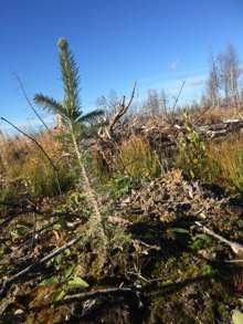 Beskrivning: Conniflexbehandlad planta i brandområdet, Efter skogsbrand, pånyttfödelse, Kundbesök i brandområdet utanför Sala, planta, gran