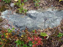Beskrivning: Trädstammar, stenröse, mossa, växt