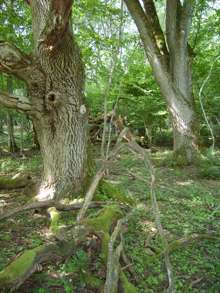 Beskrivning: Gamla träd med mossa. Ekopark Ridö Sundbyholmsarkipelagen