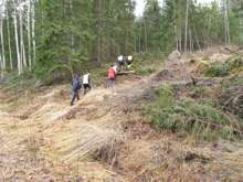 Beskrivning: Vandring uppför backe, samarbete, virkesförsäljning, skog, Gysinge Skog