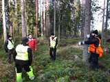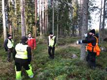 Beskrivning: Diskussion i skogen om hur planeraren tänkt. Från vänster syns Mikael Rhönnstad, Tobias Nilzon, Kånsab, Vegard Haanaes, vd Gysinge, skördarförare, Kånsab, och Erik som är Gysinges planerare.