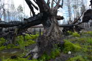 Beskrivning: Död ved, stubbe, kol, grönskande mossa, fällda träd, fallna träd, Ekopark Öjesjöbrännan, liv efter brand, växtlighet, liv, pånyttfödelse