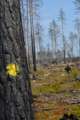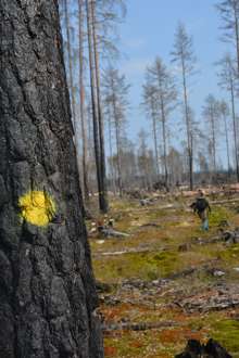 Beskrivning: Markering på träd, Planering för ekoparksleden, Ekopark Öjesjöbrännan, liv efter brand, växtlighet, liv, pånyttfödelse