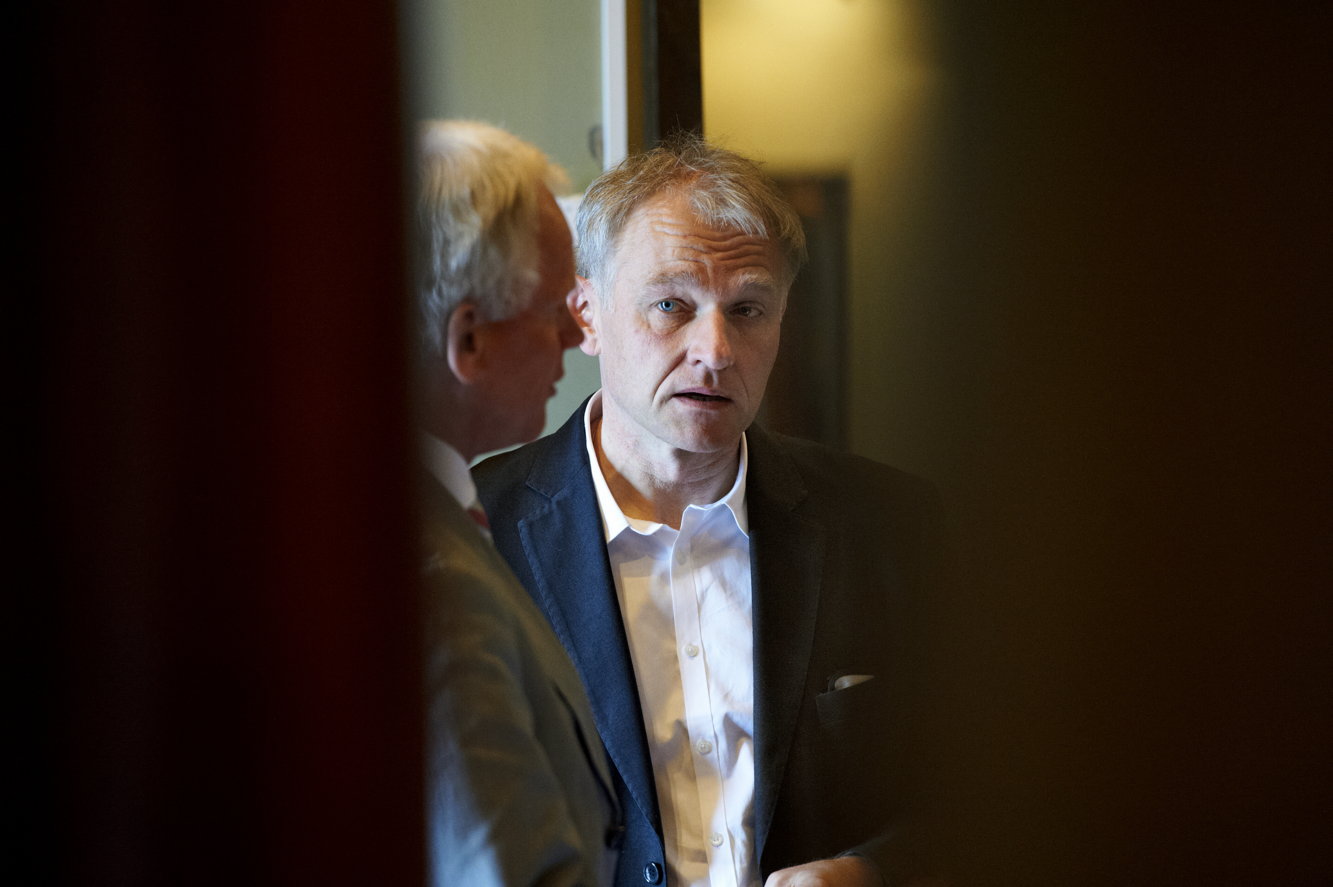 • Beskrivning: Sveaskogs miljöchef Olof Johansson i samspråk med styrelseledamot Mats G Ringesten. Årsstämma, bolagsstämma 2012. Konserthuset 2012-04-26.