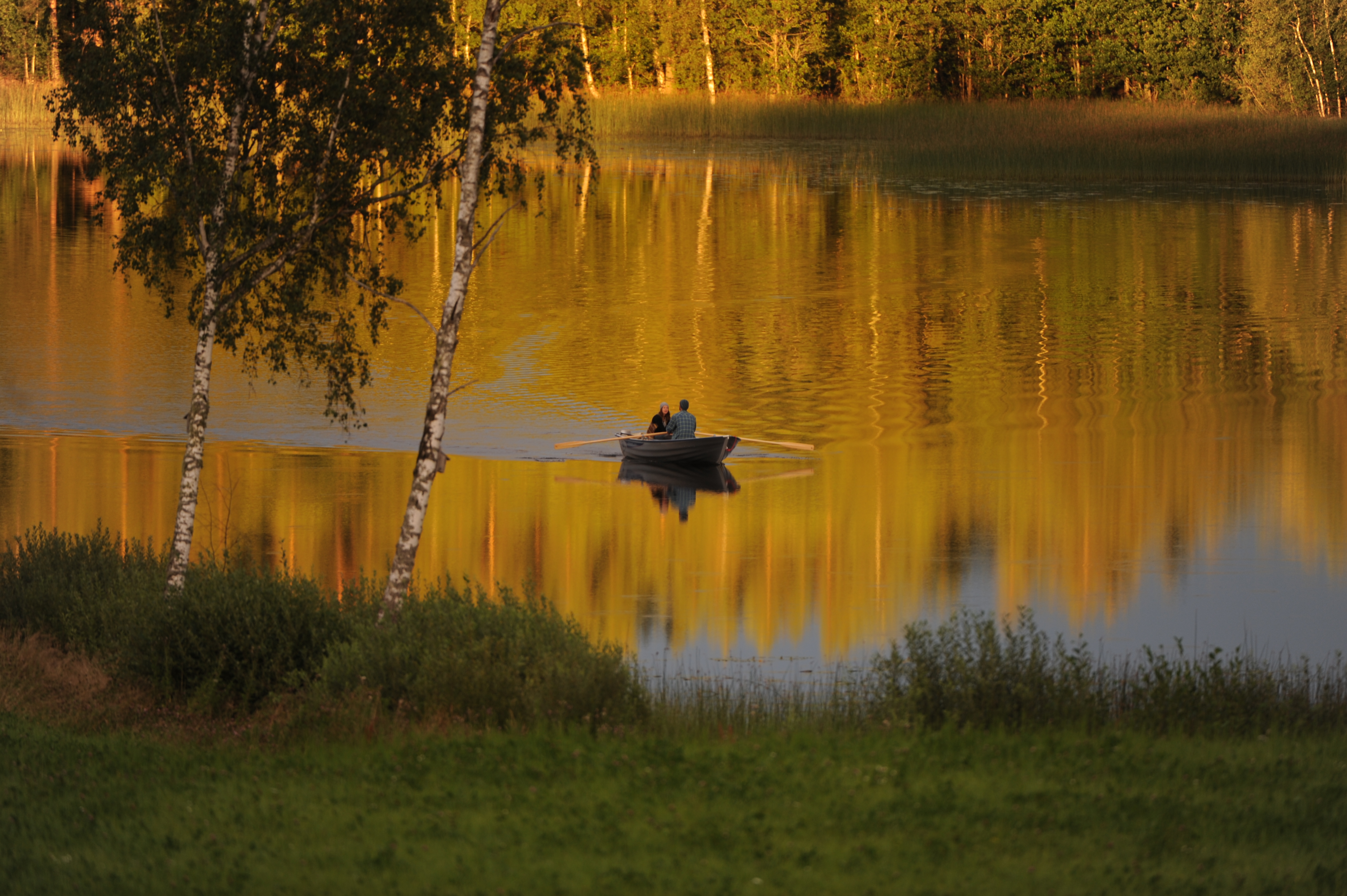 - Beskrivning: Par som ror båt på sjö i sommarkvällen