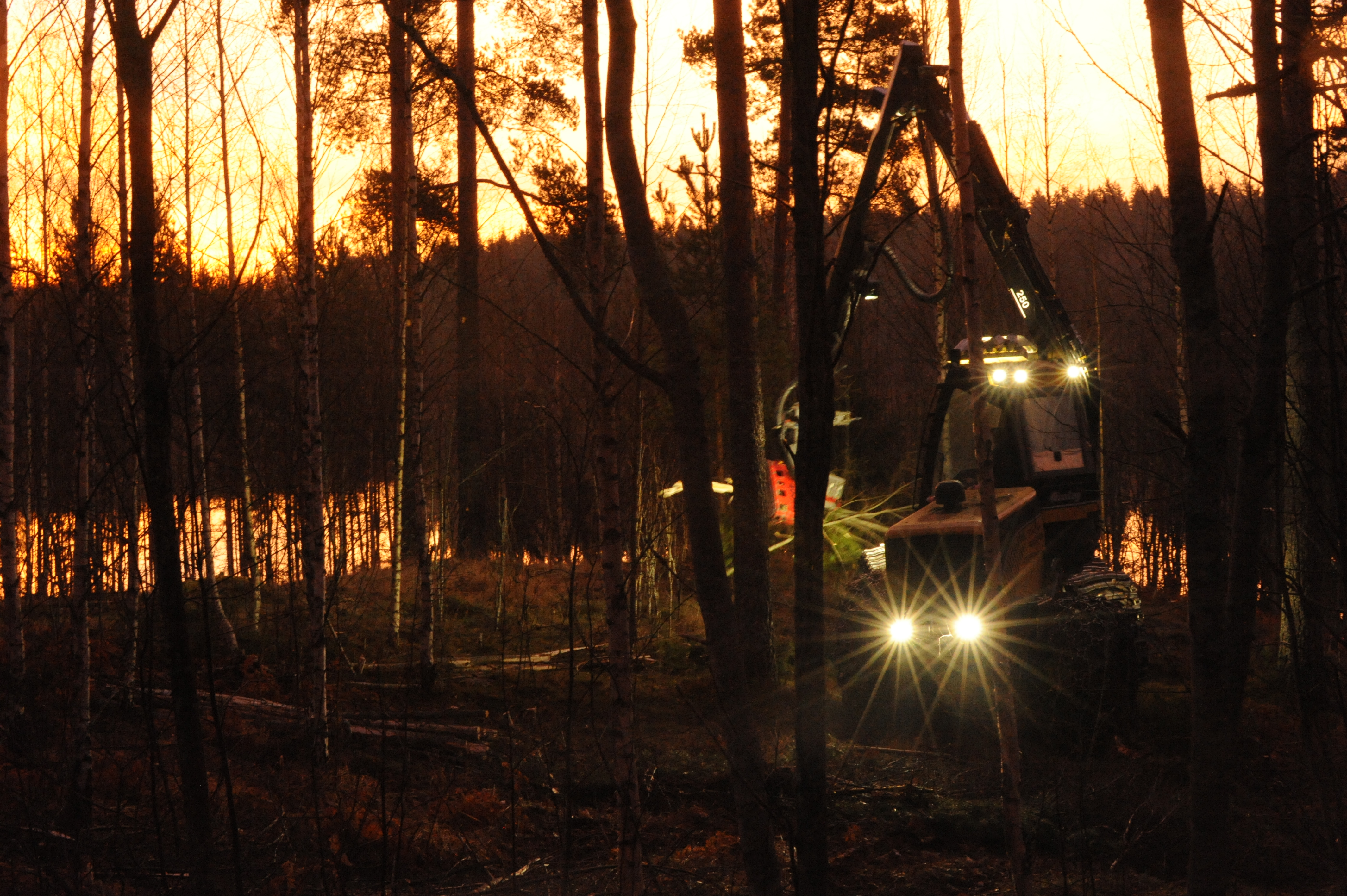 • Beskrivning: Gallringsskördare på natten, avverkning, gallring