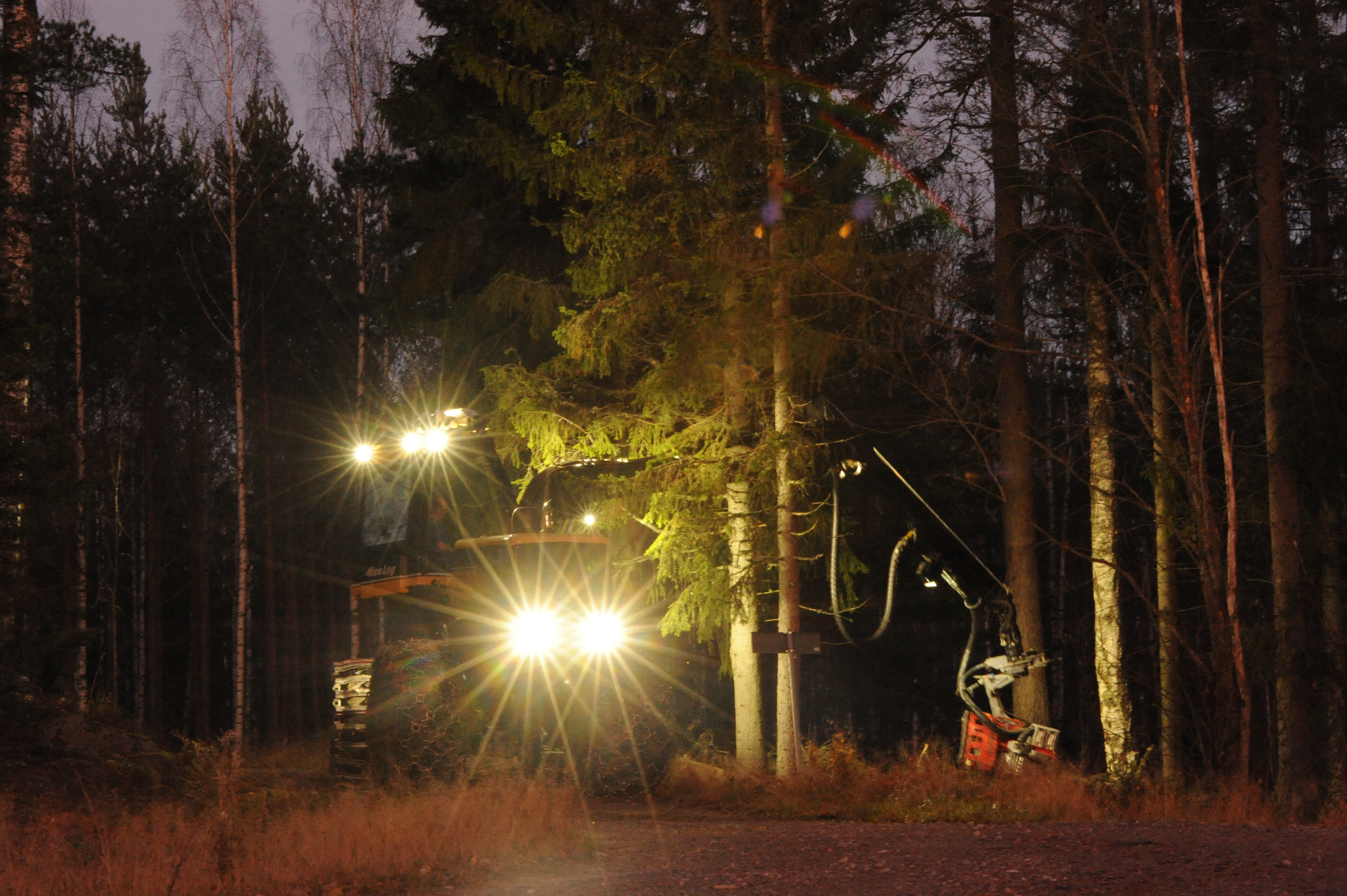 - Beskrivning: Gallringsskördare på natten, avverkning, gallring
