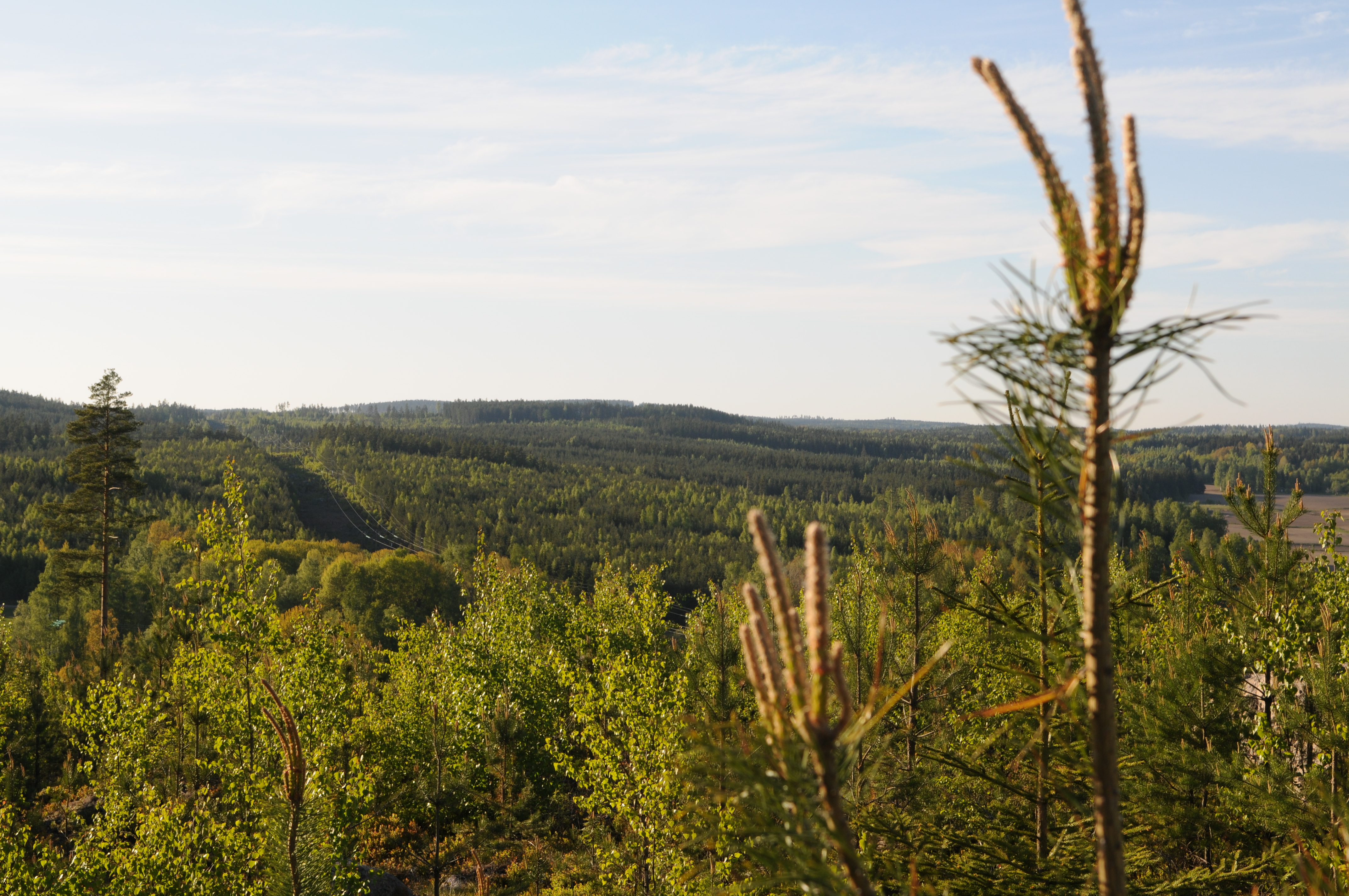 • Beskrivning: Landskap. Tall som skjuter skott i förgrunden