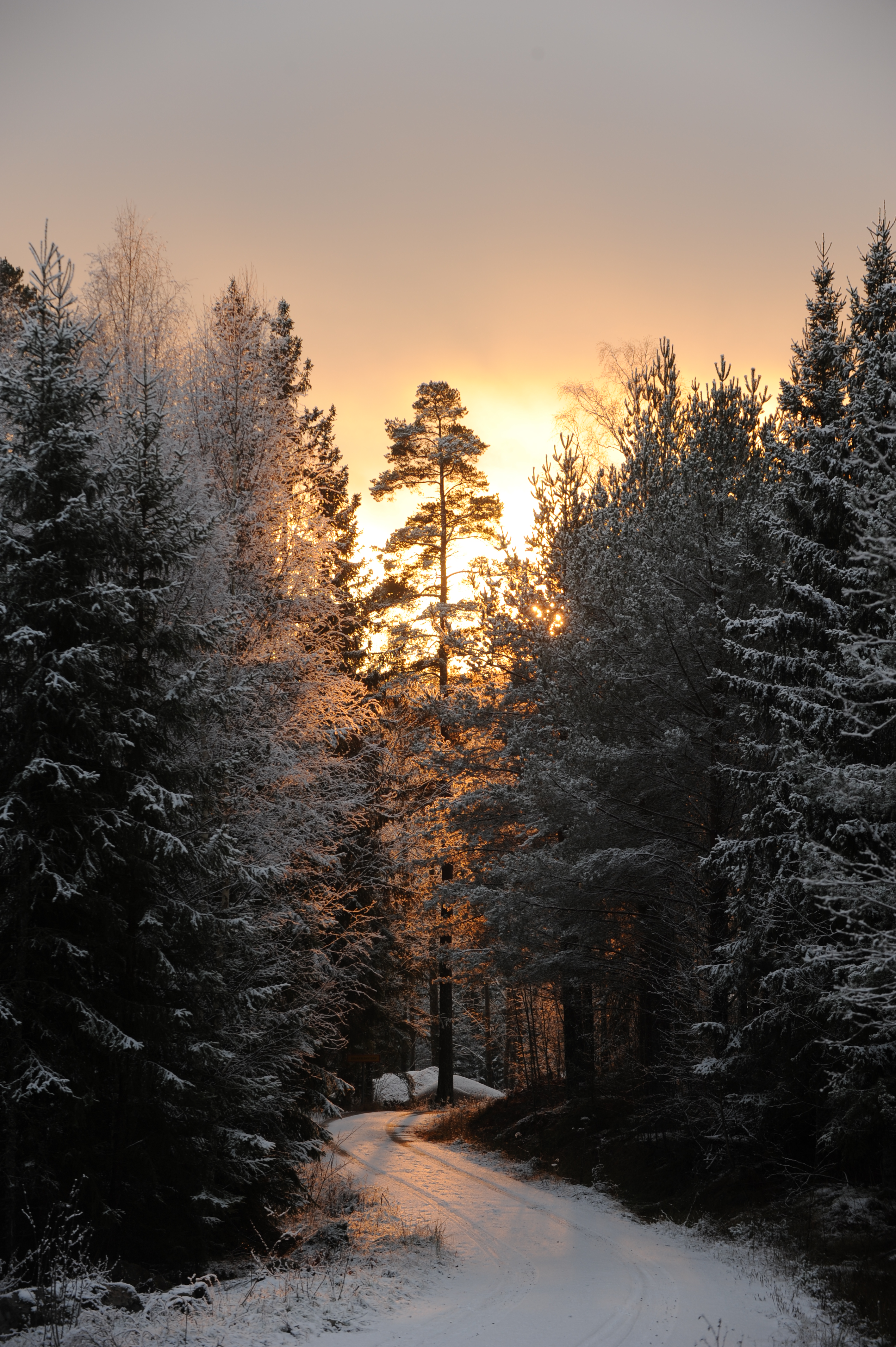 - Beskrivning: Solen lyser bakom träden, rosa lila himmel