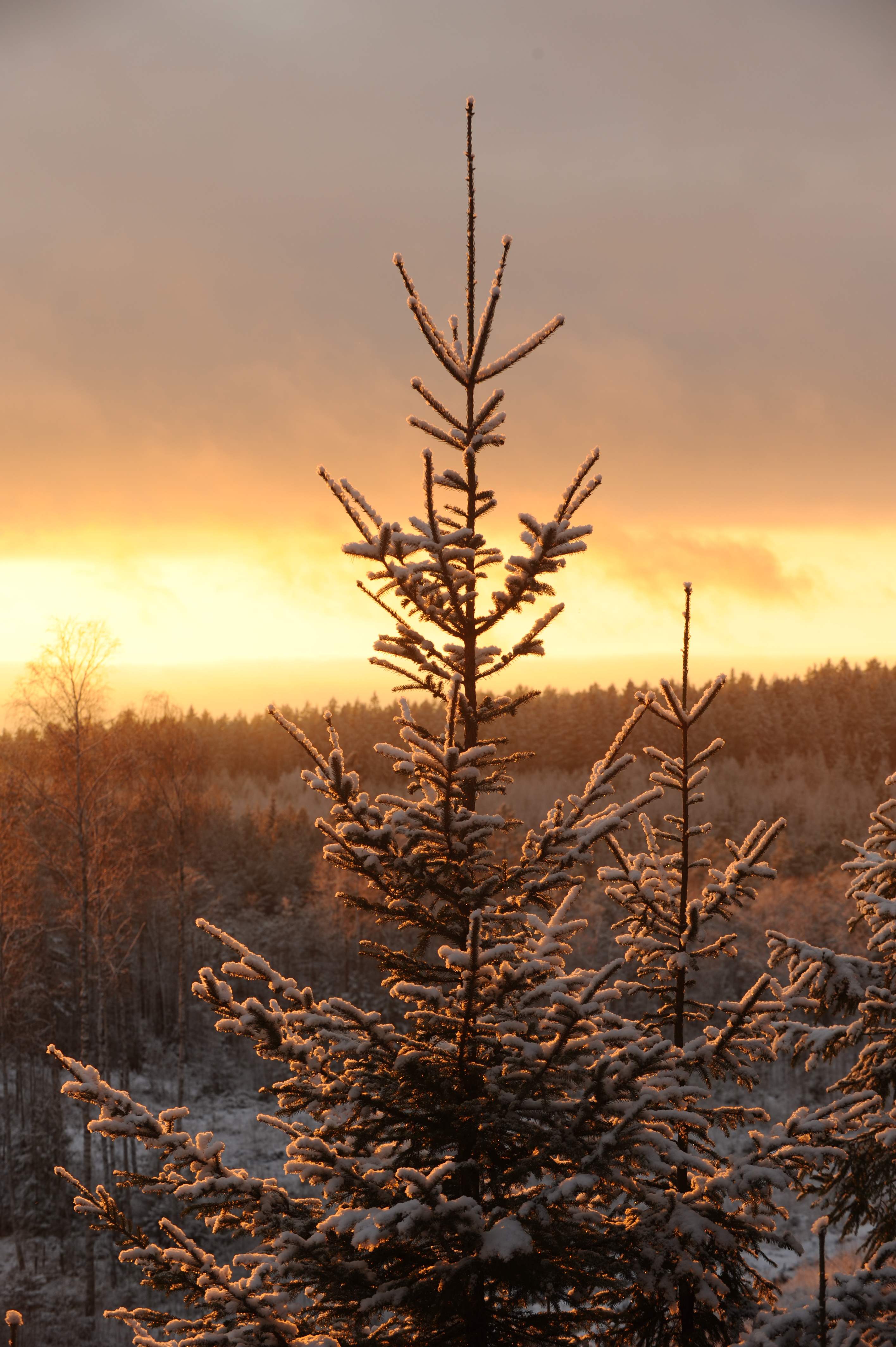 - Beskrivning: Solen lyser bakom träden, rosa lila himmel, gran i förgrunden
