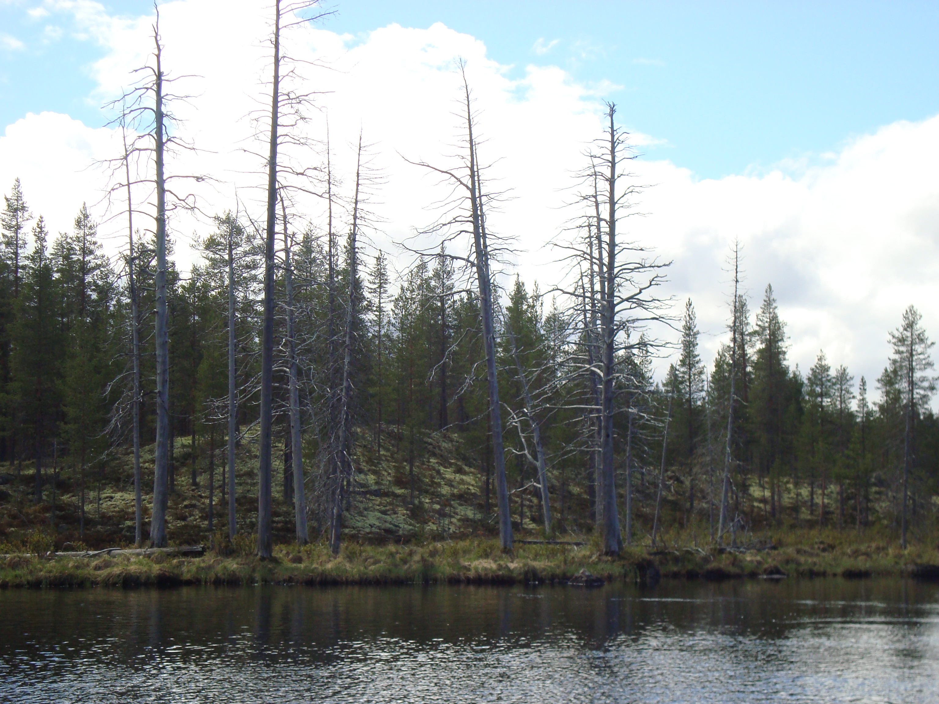 • Beskrivning: Sjö, torrfuror, Ekopark Tranuberget. Bilden visar hur vattendynamiken och bävern påverkar skogen och skapar död ved.