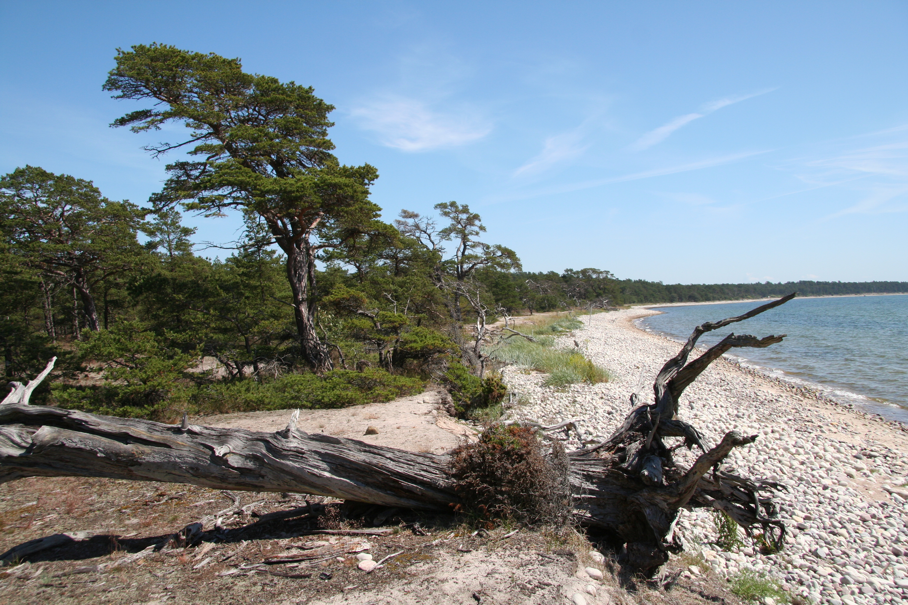 - Beskrivning: Bödakusten, östra. Tallar på strand. Ekopark Böda.