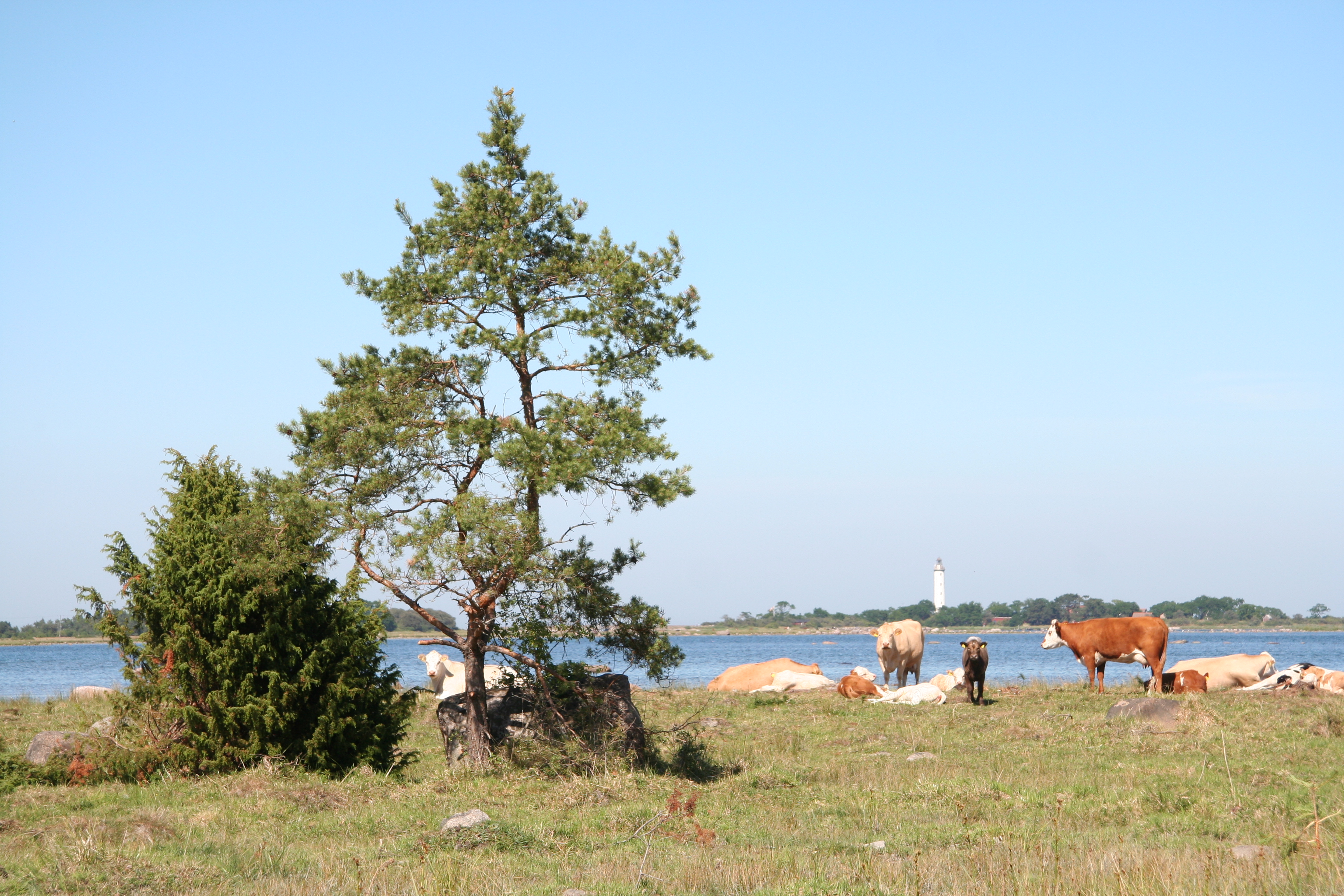 - Beskrivning: Betesdjur, kor, kreatur på strandängar. Fyren Långe Erik i bakgrunden. Ekopark Böda.