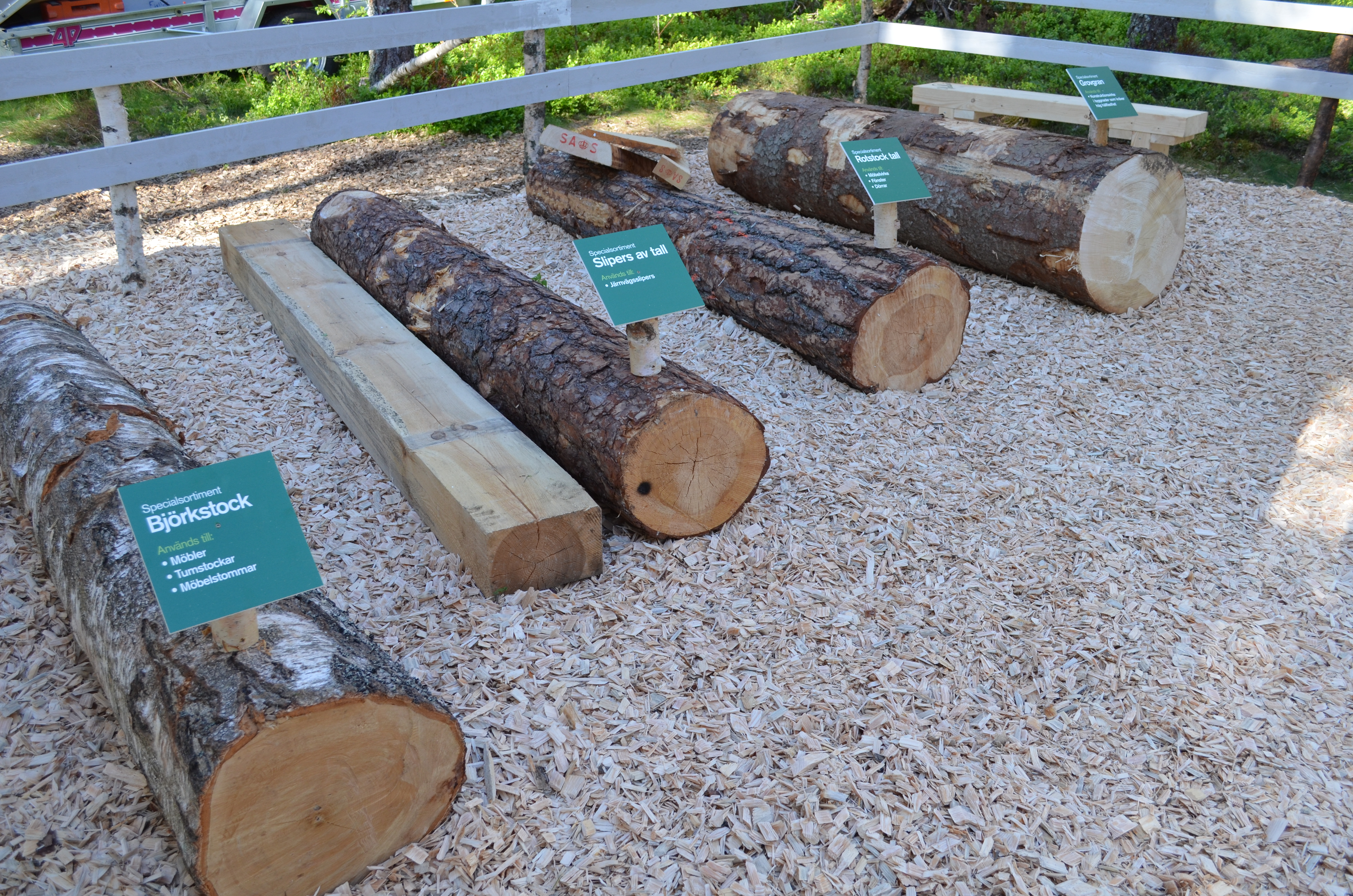 - Beskrivning: Sveaskogs medverkan på Elmia-mässan, Elmia Wood Sveaskog visar upp olika träsorter, björkstock, slipers av tall, rotstock tall, grovgran, stockar