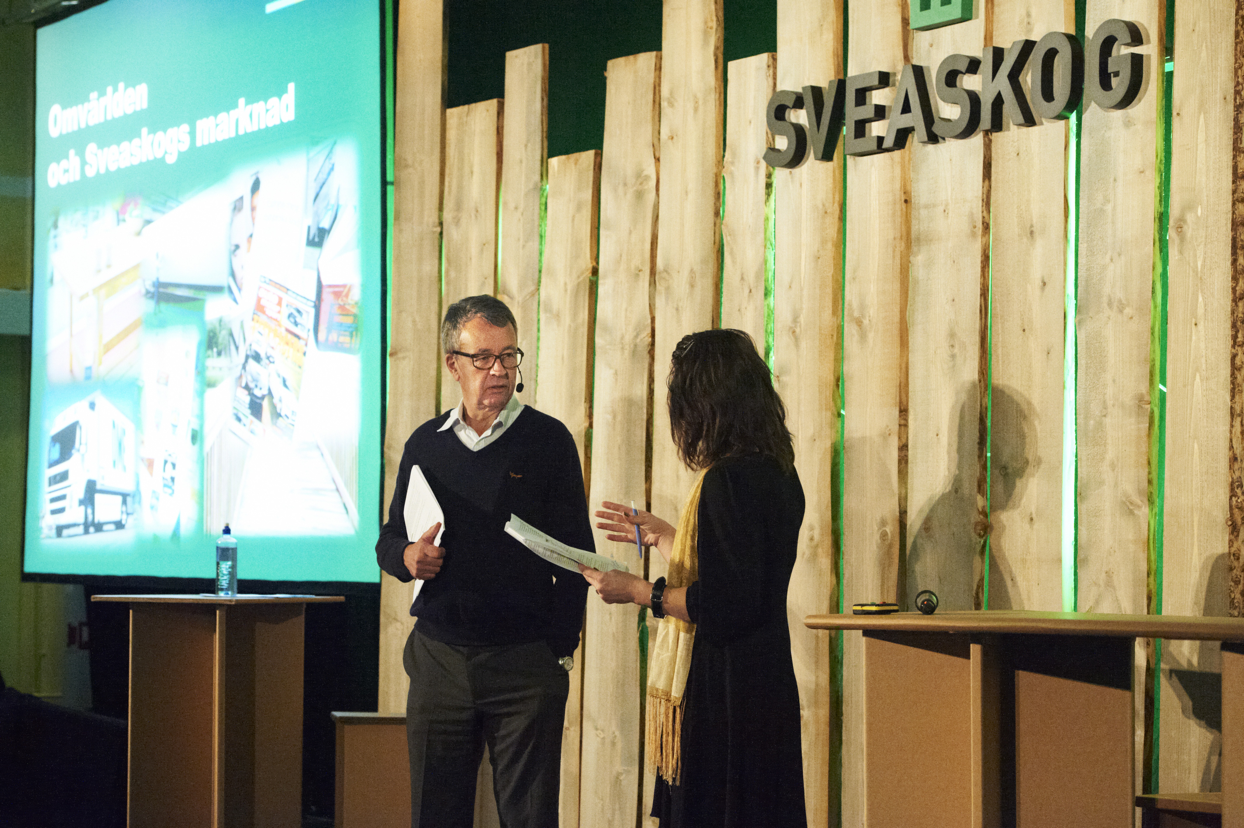 - Beskrivning: Sveaskogs vd Per-Olof Wedin och moderatorn Mia Odabas samtalar. Chefsmöte, ledarmöte, 24 november 2011, Nova Park Arlanda