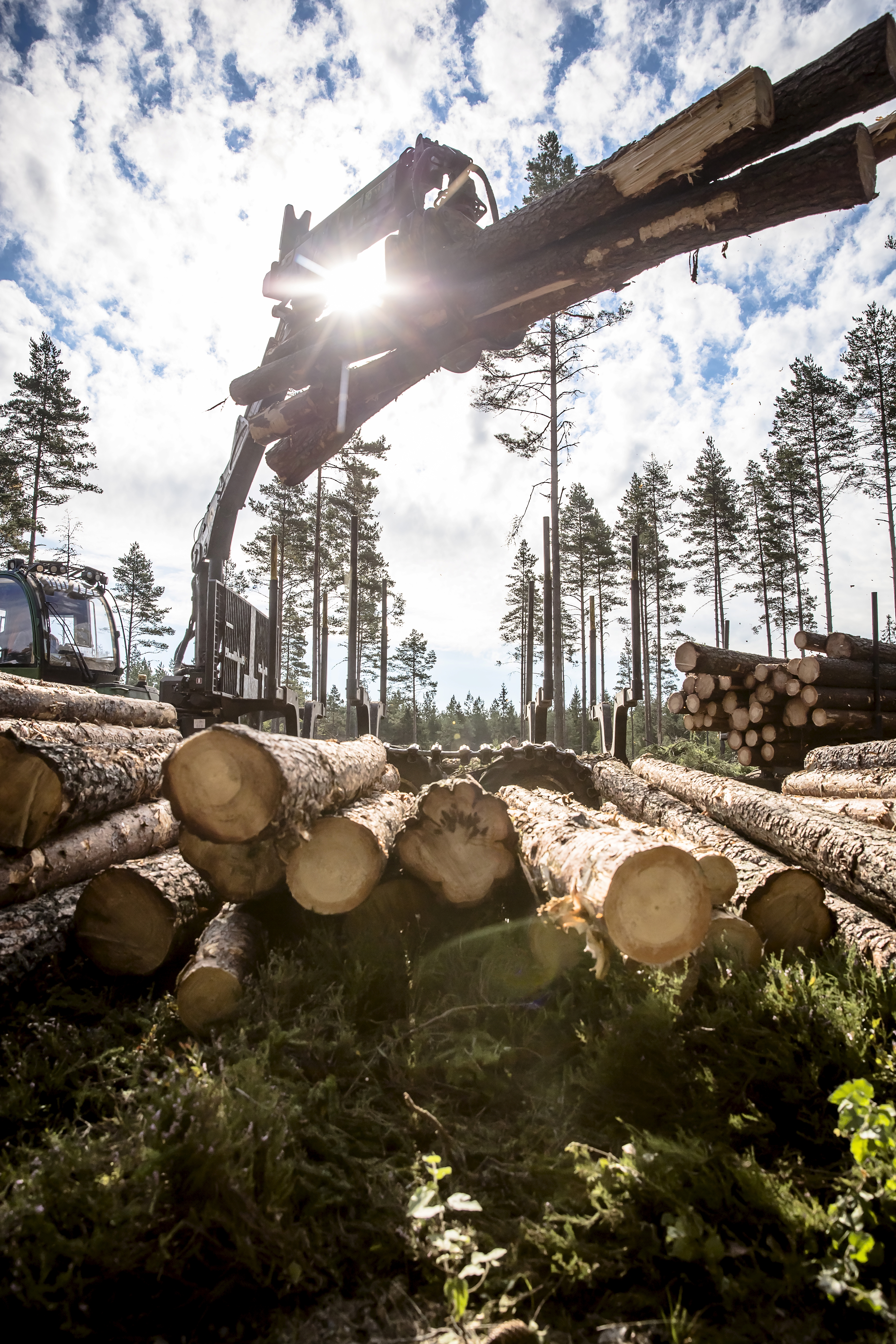 • Beskrivning: timmer i motljus, talltimmer, skördare, avverkning, trä, tall, teknik, utveckling, skogsbruk, avverkningsmetodik, metod, forum sveaskog nr 5 2013