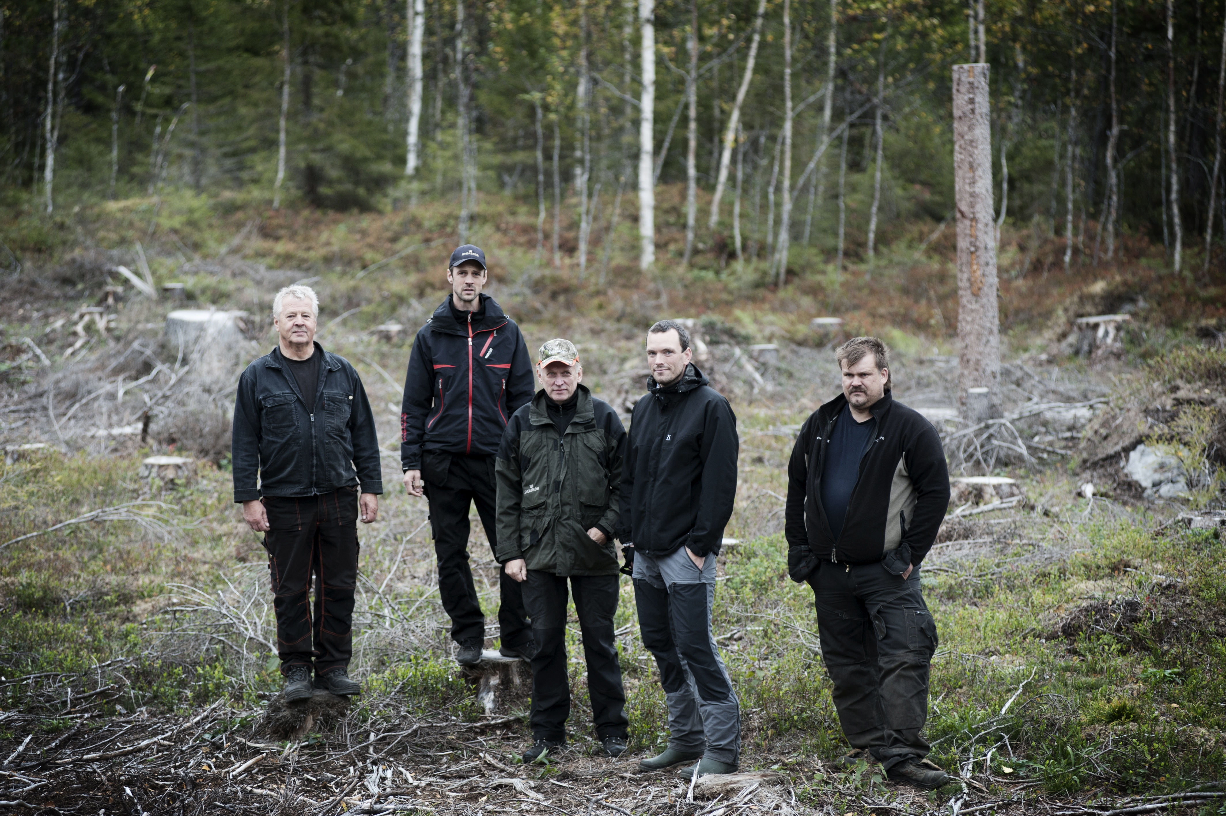 - Beskrivning: Gruppfoto Lars Risén, Jan Forsström, Fredrik Risén, Bror Olofsson och Anders Nenzén, Hyggligt avverkat, Forum Sveaskog nr 5 2013, vackert hygge, naturvård.