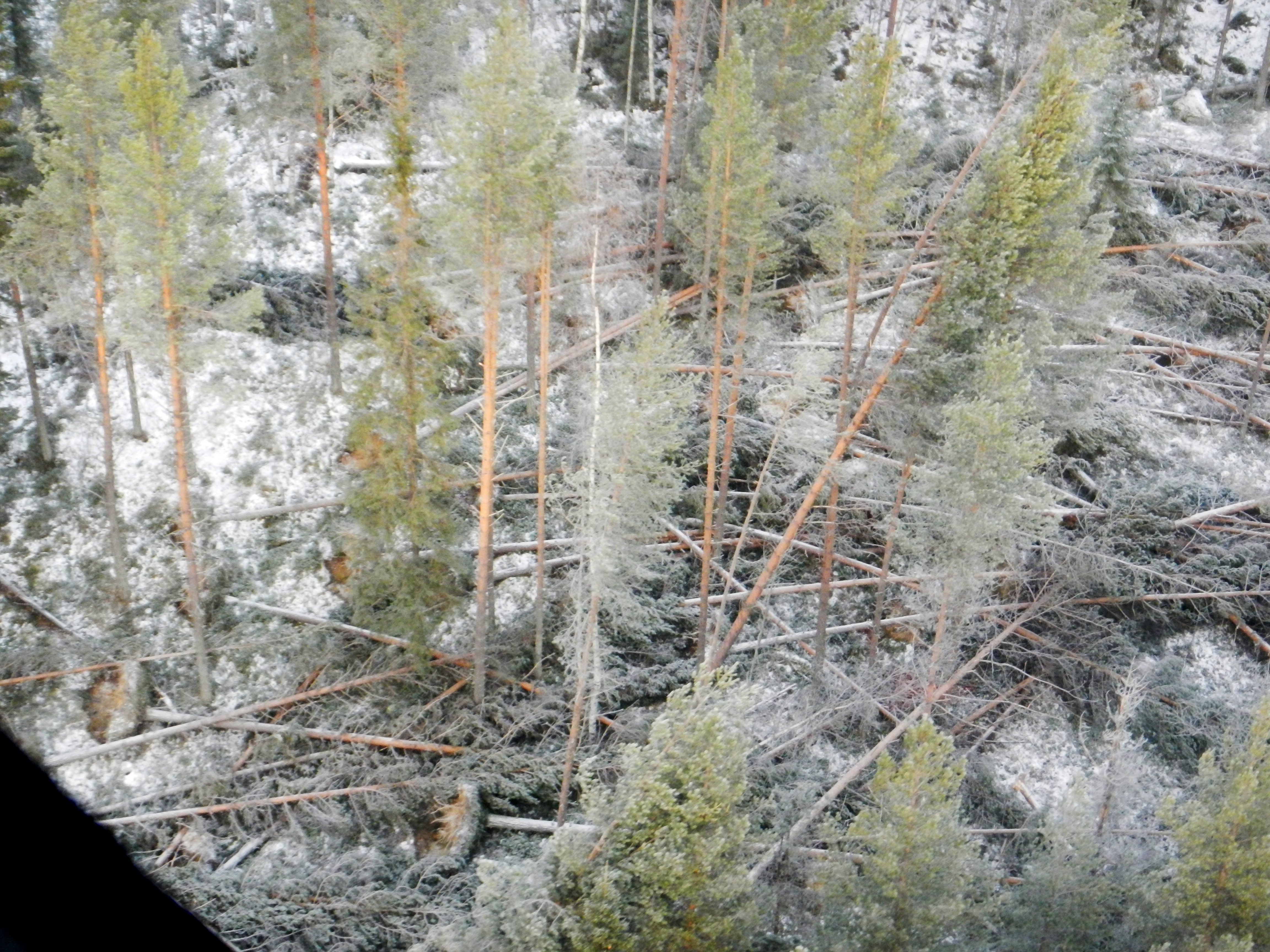 - Beskrivning: Bilder från helikopterinventeringen i Västerbotten efter stormen Hilde som inträffade den 16 november 2013, Brutna stammar, stormfällning, stormskador, landskap