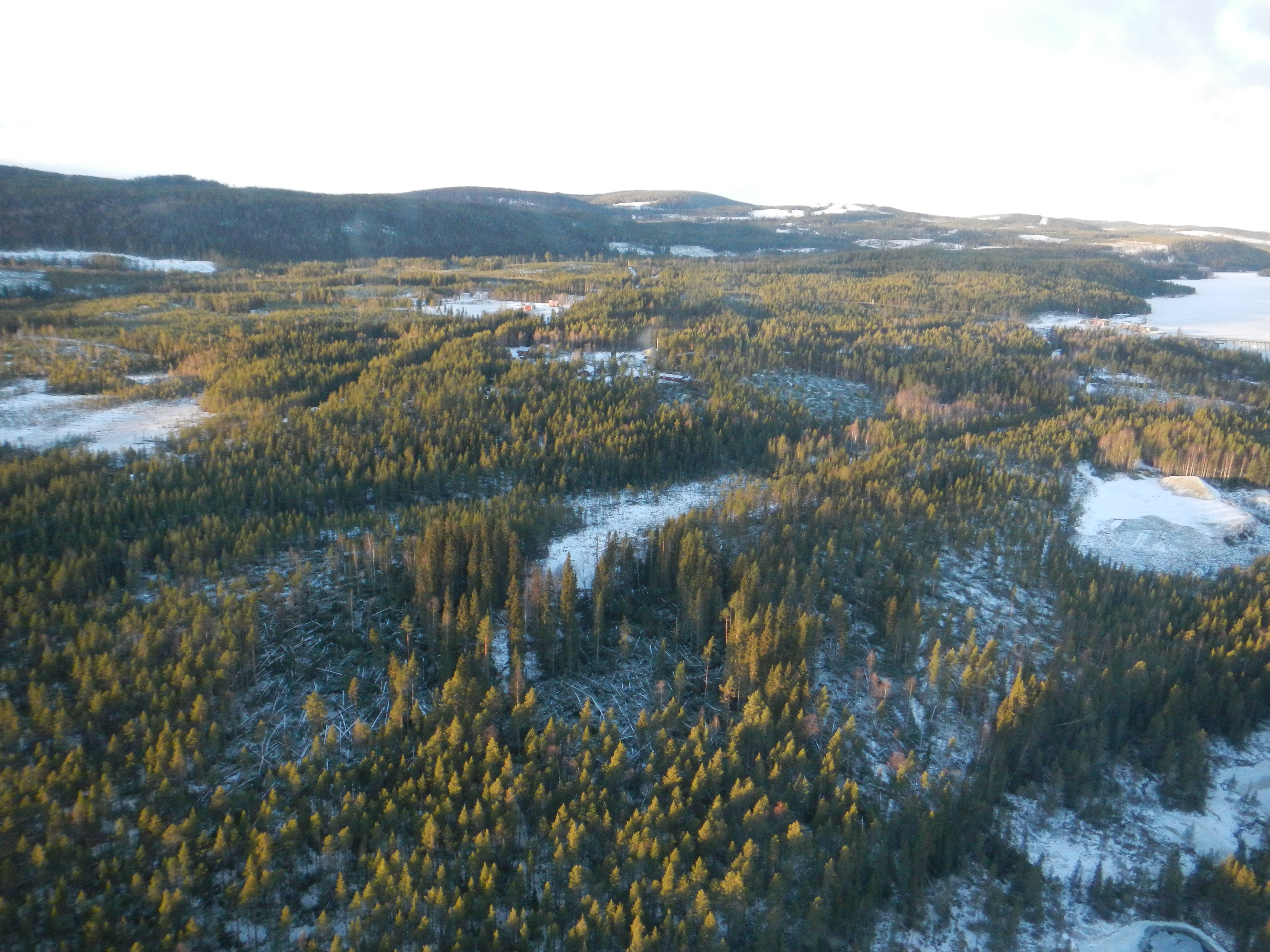 - Beskrivning: Bilder från helikopterinventeringen i Västerbotten efter stormen Hilde som inträffade den 16 november 2013, Brutna stammar, stormfällning, stormskador, landskap