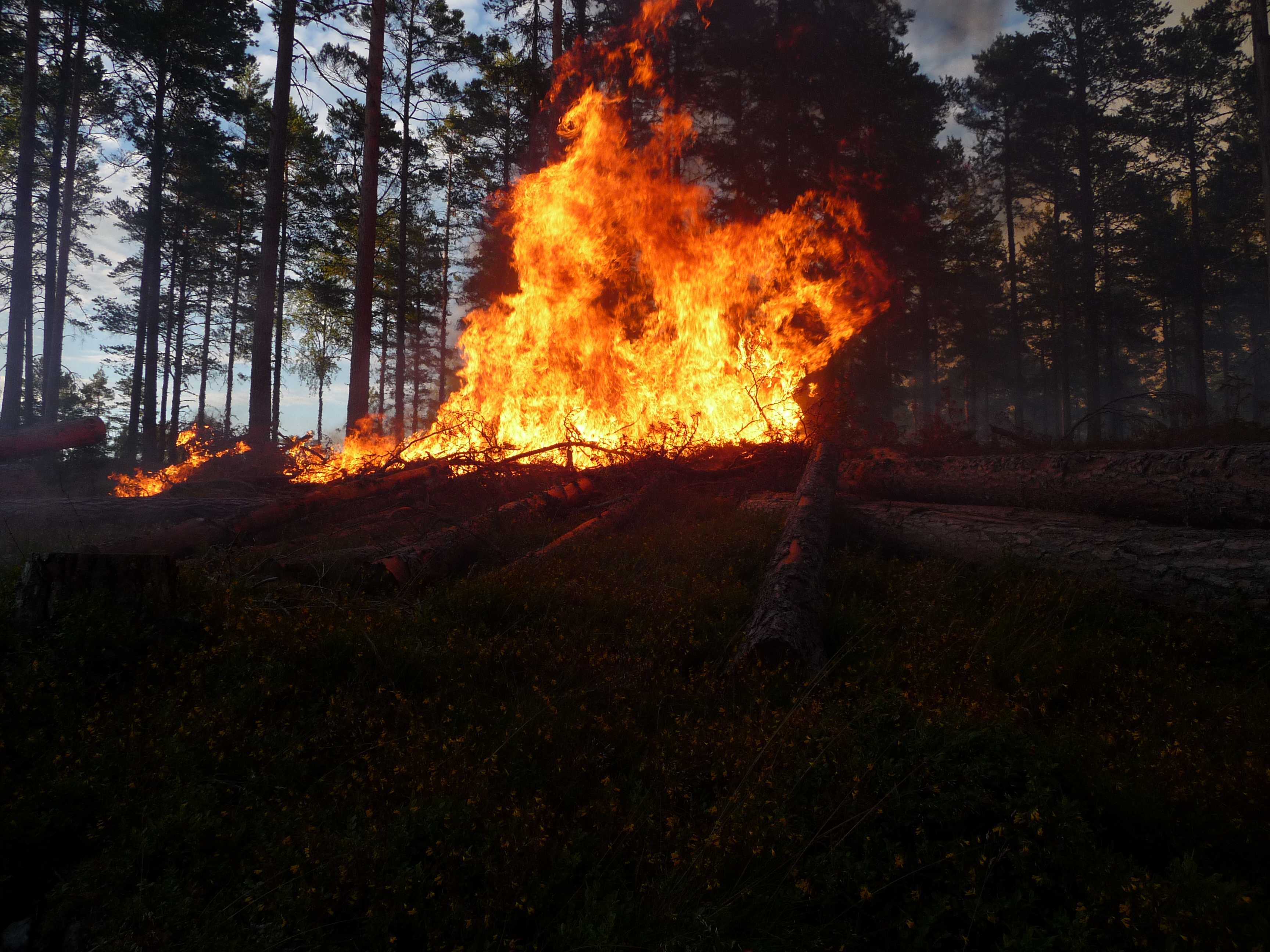 - Beskrivning: Naturvårdsbränningen omfattade 34 hektar tallskog med en medelålder på 110 år, hyggesbränning, brand, rök, eld, mörker, natt, kväll