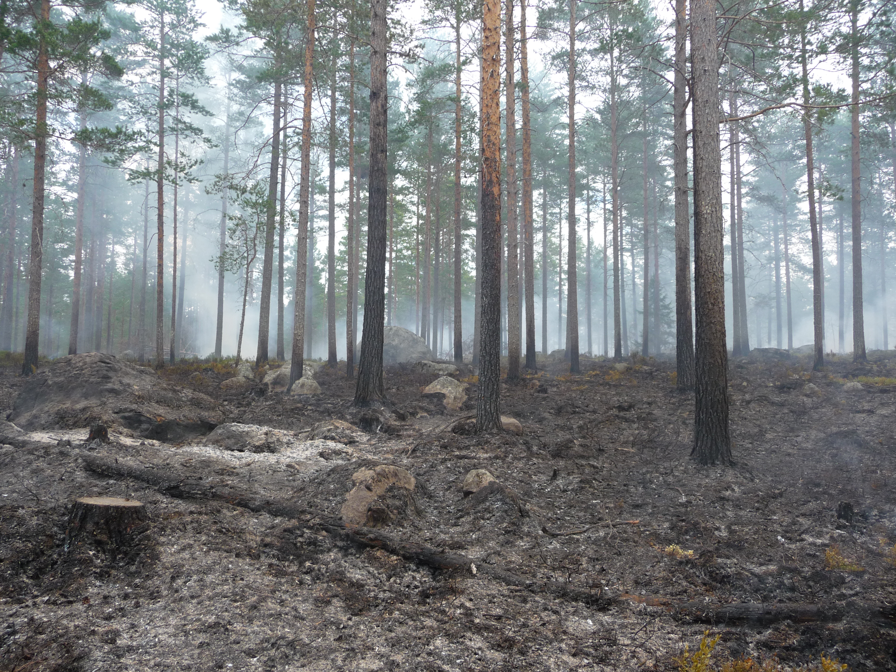 - Beskrivning: Efter naturvårdsbränning, naturvårdsbränningen omfattade 34 hektar tallskog med en medelålder på 110 år, hyggesbränning, brand, aska, rök,