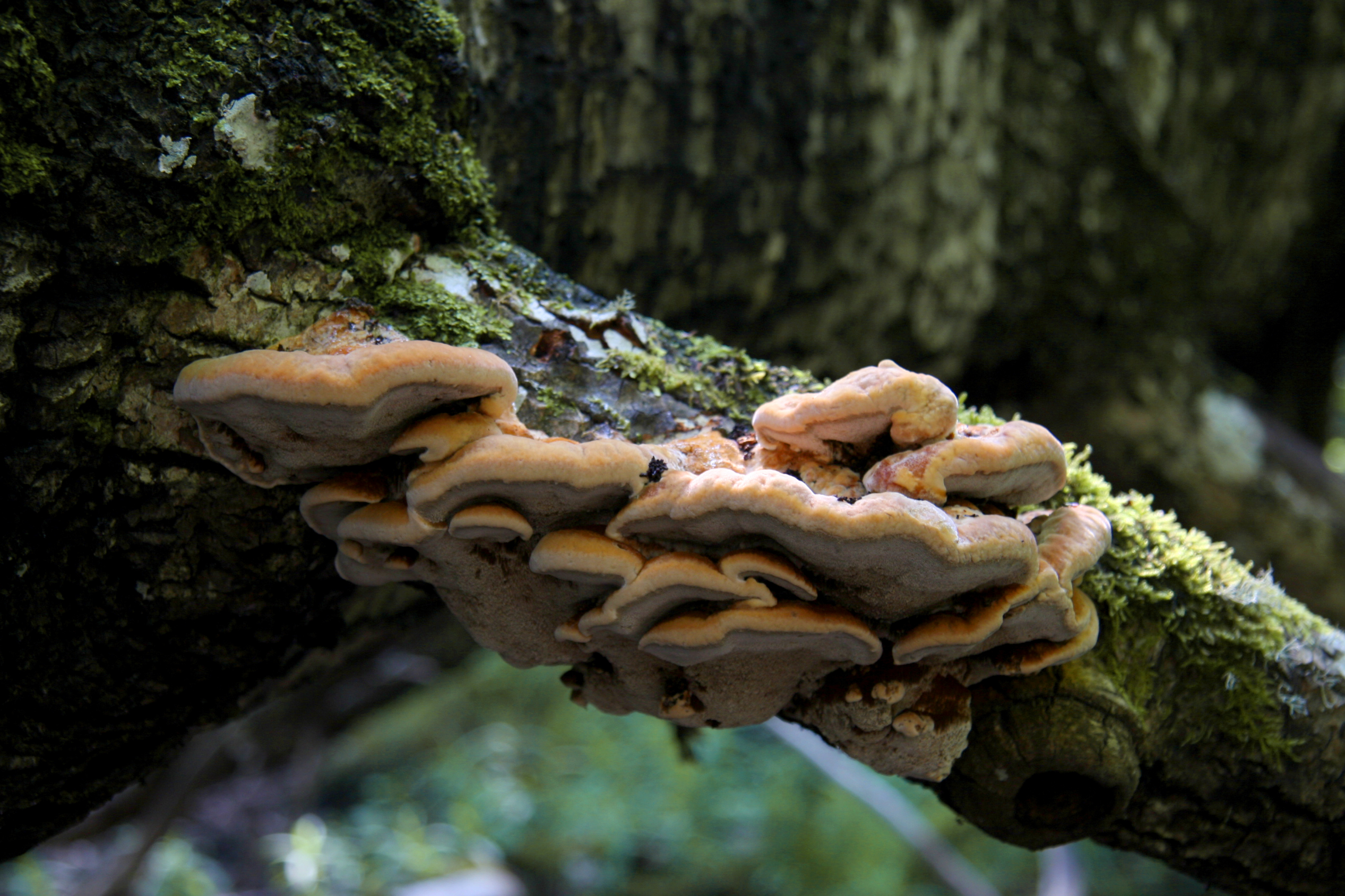 • Beskrivning: Inonotus rheades växandes på gren, bark, Svamp, fungi, svampdjur, spongier, gren, trä, mossa, ticka