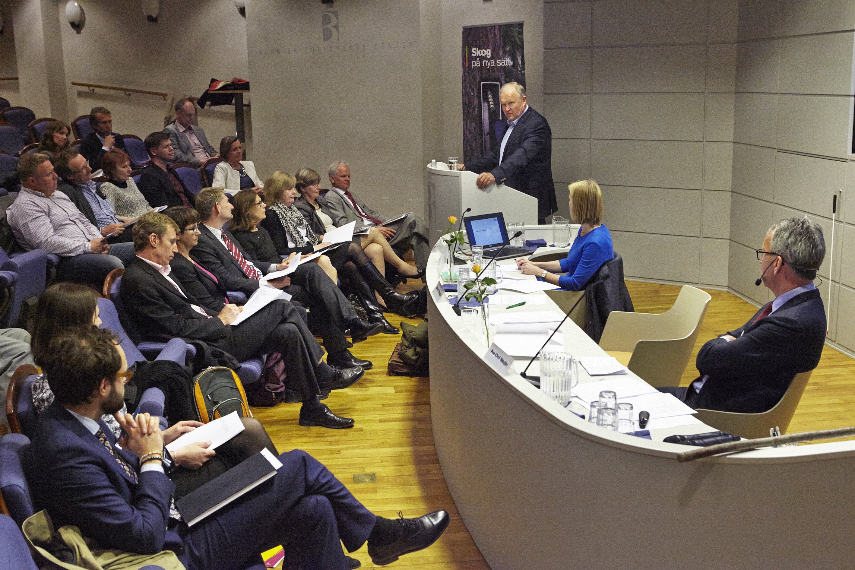 - Beskrivning: Göran Person, Viveka Beckeman, Per-Olof Wedin, Sveaskogs årsstämma 2014 i Bonnierhuset i Stockholm.