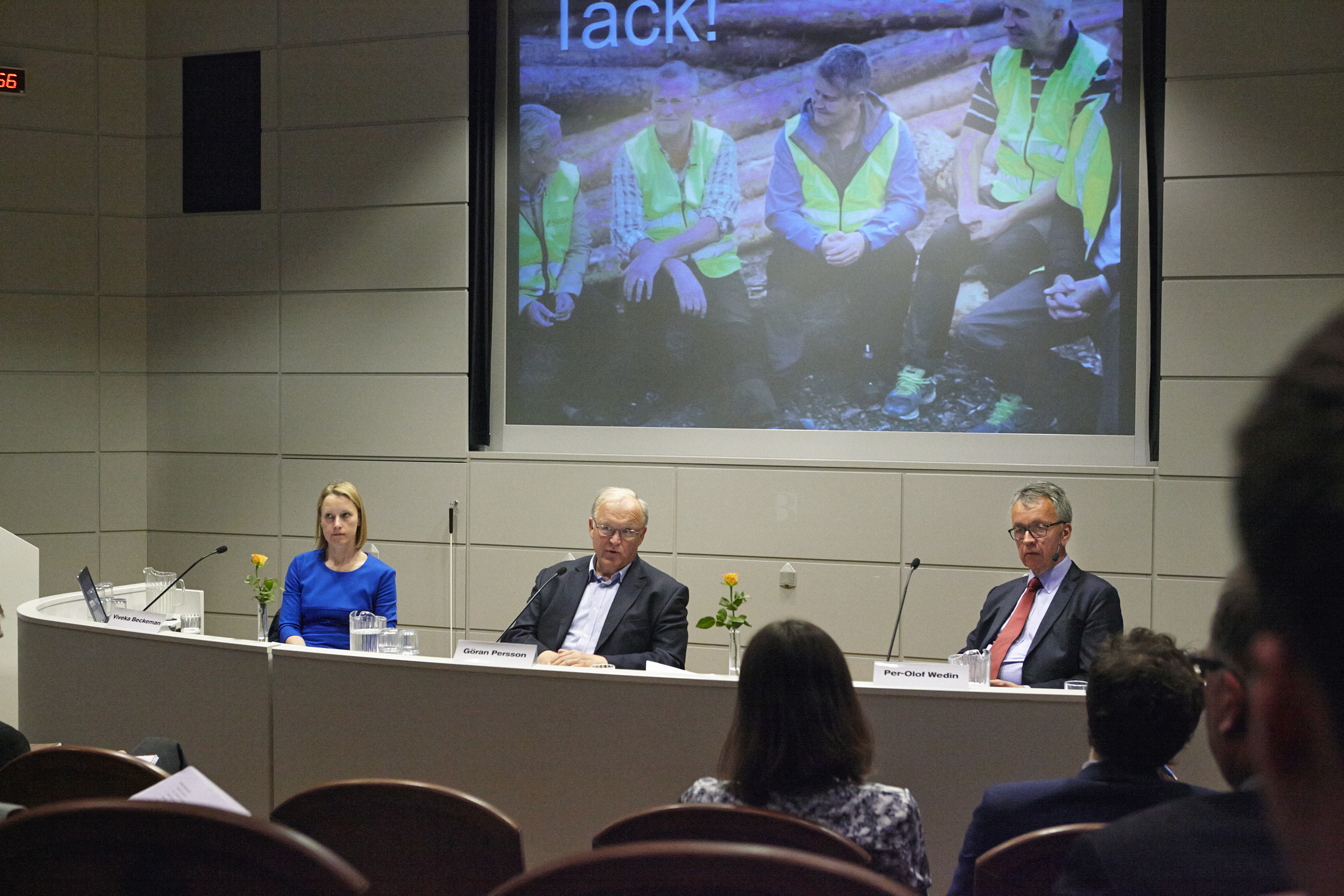 - Beskrivning: Viveka Beckeman, Göran Persson och Per-Olof Wedin, Sveaskogs årsstämma 2014 i Bonnierhuset i Stockholm.