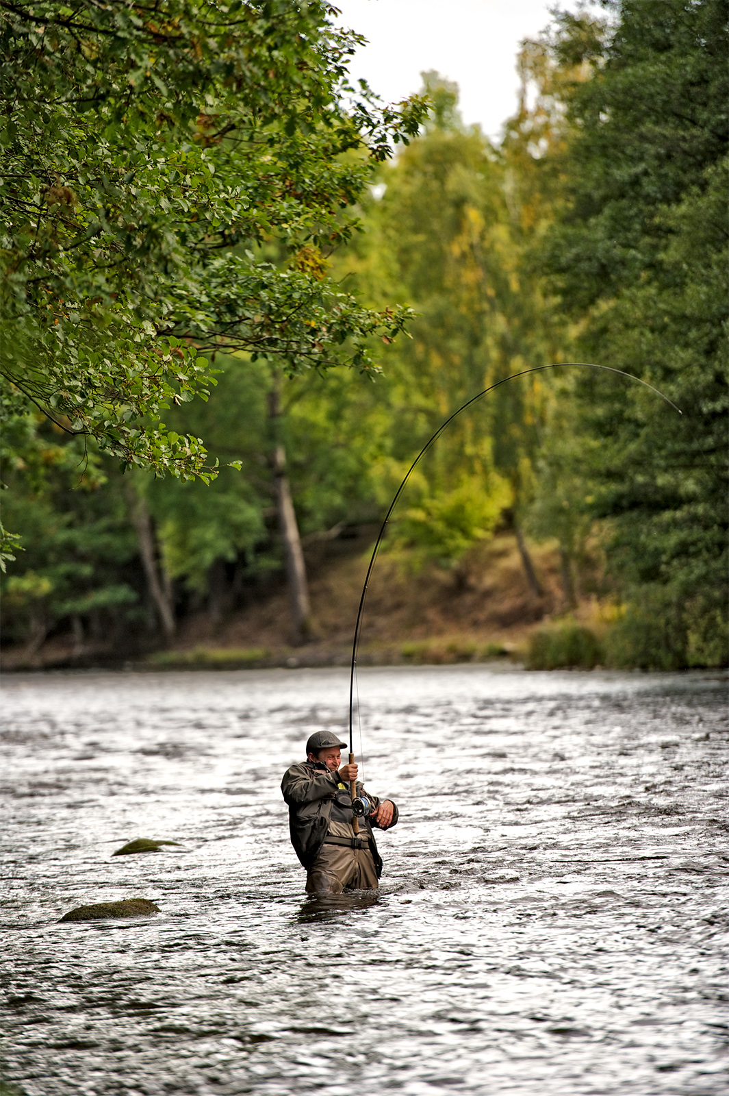 - Beskrivning: Mörrum, Mörrumsån, fiskare som fått napp