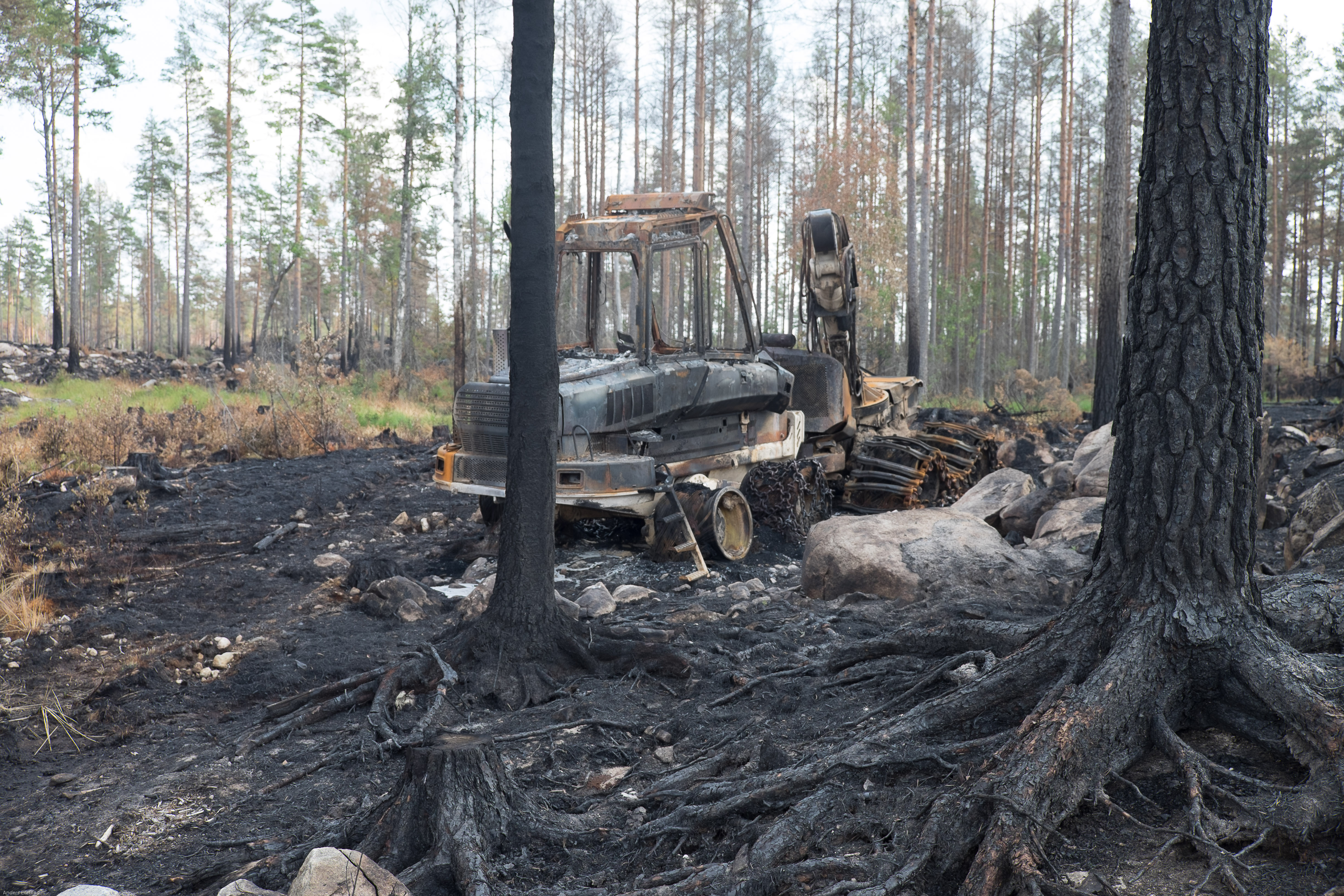 - Beskrivning: Nedbrunnen skördare, skogsmaskin, aska, obrukbar, trasig, Skogsbrand, skog, Västmanland, brandskadad