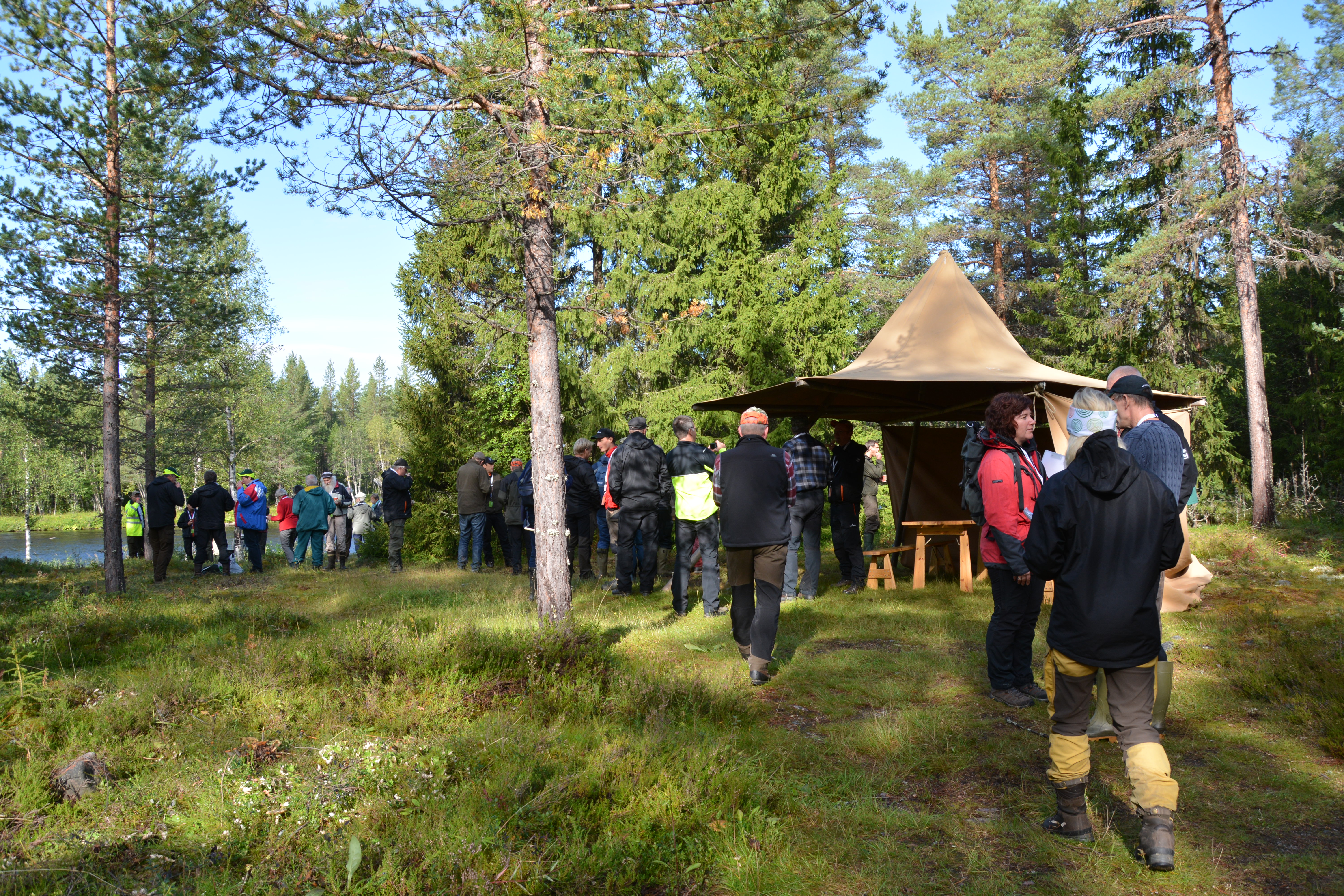 • Beskrivning: Invigning av Ekopark Fjätälven, Vid registreringen bjöds gästerna på kaffe och smörgås, besökare, kö framför kåta