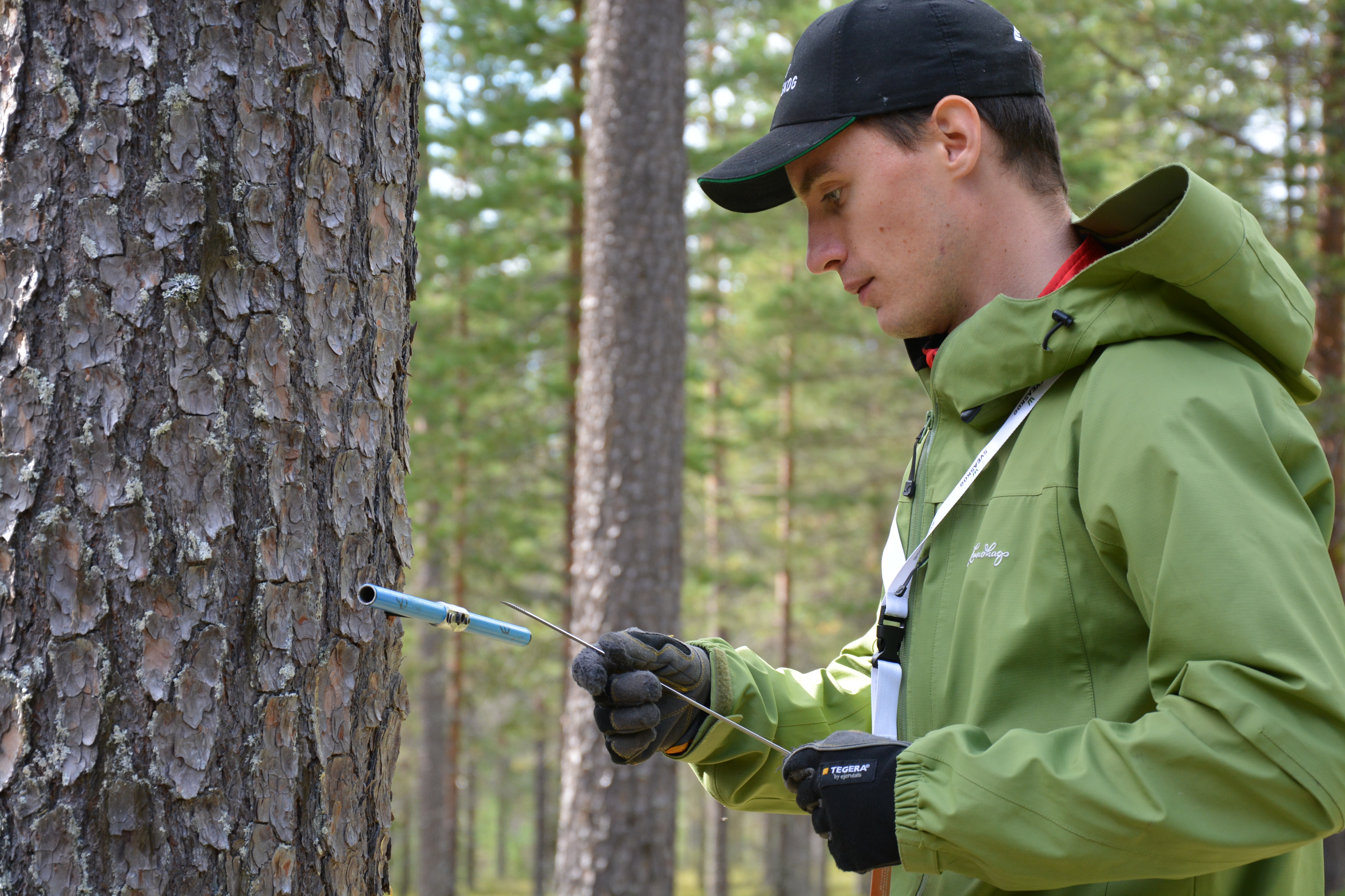 - Beskrivning: Invigning av Ekopark Fjätälven, Erik Sjögren visar hur man kan avgöra åldern på ett träd. Just det här var 300 år gammalt, tillväxtborr, borrning